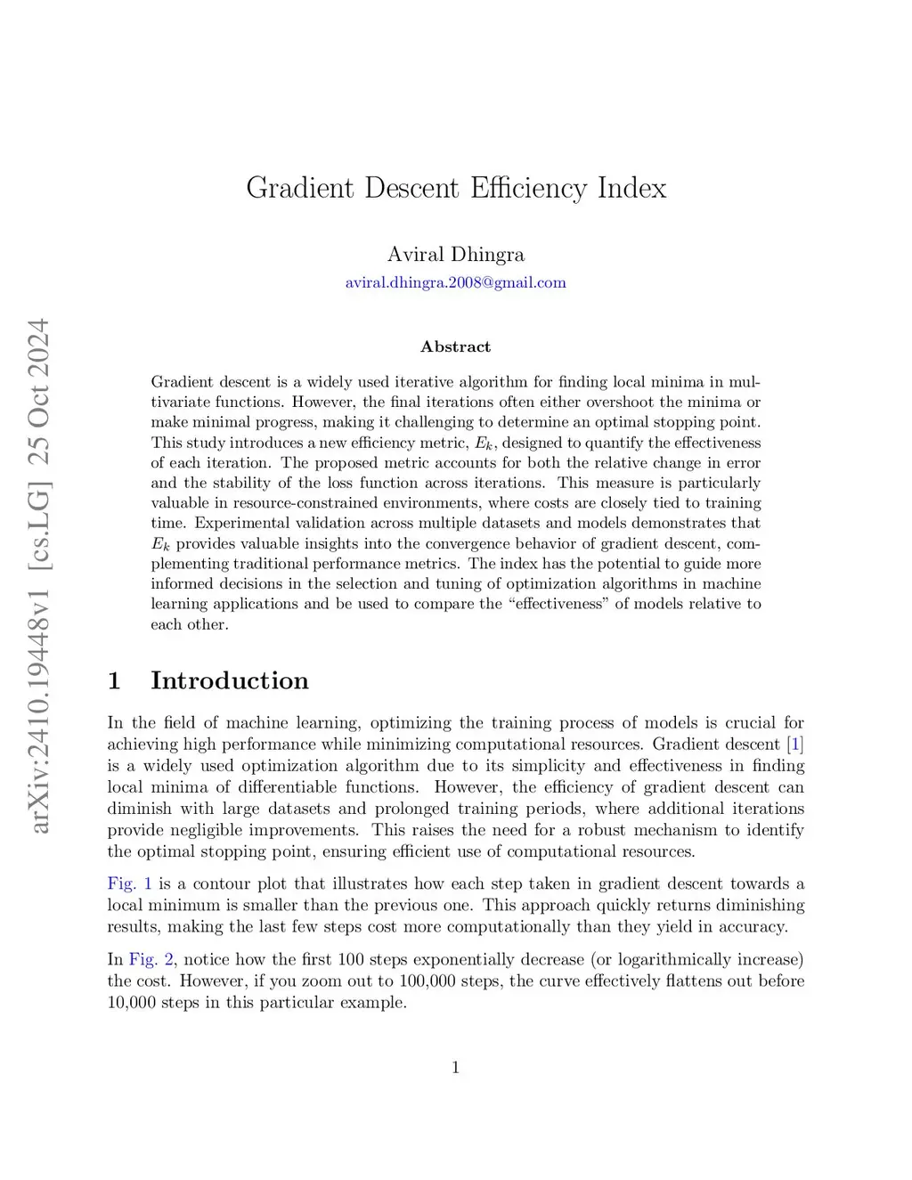 Gradient descent is a widely used iterative algorithm for finding local minima in multivariate functions. However, the final iterations often either overshoot the minima or make minimal progress, making it challenging to determine an optimal stopping point. This study introduces a new efficiency metric, Ek, designed to quantify the effectiveness of each iteration. The proposed metric accounts for both the relative change in error and the stability of the loss function across iterations. This measure is particularly valuable in resource-constrained environments, where costs are closely tied to training time. Experimental validation across multiple datasets and models demonstrates that Ek provides valuable insights into the convergence behavior of gradient descent, complementing traditional performance metrics. The index has the potential to guide more informed decisions in the selection and tuning of optimization algorithms in machine learning applications and be used to compare the "effectiveness" of models relative to each other.