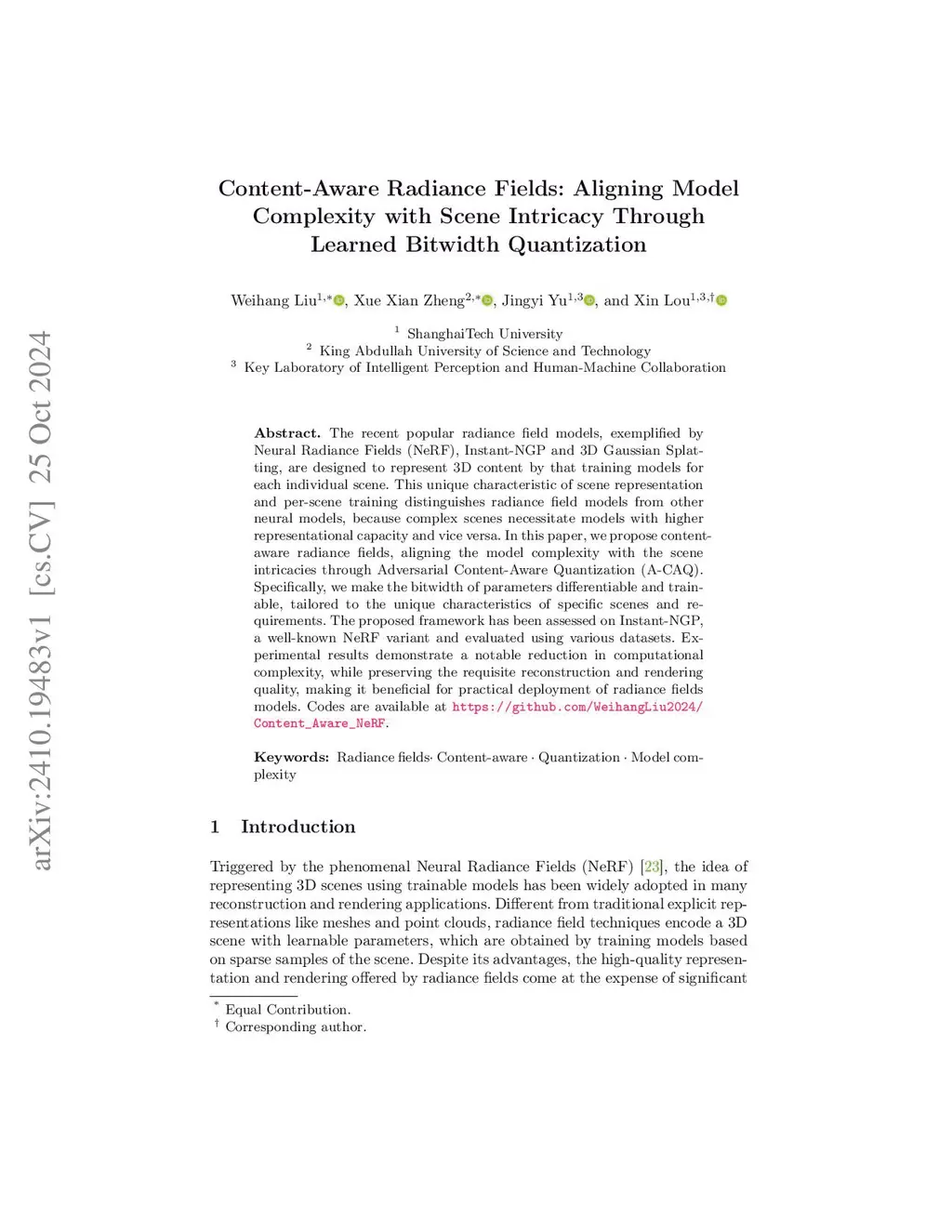 The recent popular radiance field models, exemplified by Neural Radiance Fields (NeRF), Instant-NGP and 3D Gaussian Splatting, are designed to represent 3D content by that training models for each individual scene. This unique characteristic of scene representation and per-scene training distinguishes radiance field models from other neural models, because complex scenes necessitate models with higher representational capacity and vice versa. In this paper, we propose content-aware radiance fields, aligning the model complexity with the scene intricacies through Adversarial Content-Aware Quantization (A-CAQ). Specifically, we make the bitwidth of parameters differentiable and trainable, tailored to the unique characteristics of specific scenes and requirements. The proposed framework has been assessed on Instant-NGP, a well-known NeRF variant and evaluated using various datasets. Experimental results demonstrate a notable reduction in computational complexity, while preserving the requisite reconstruction and rendering quality, making it beneficial for practical deployment of radiance fields models. Codes are available at https://github.com/WeihangLiu2024/Content_Aware_NeRF.