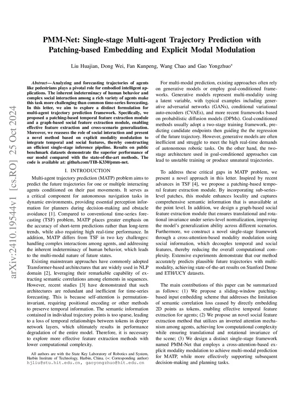 Analyzing and forecasting trajectories of agents like pedestrians plays a pivotal role for embodied intelligent applications. The inherent indeterminacy of human behavior and complex social interaction among a rich variety of agents make this task more challenging than common time-series forecasting. In this letter, we aim to explore a distinct formulation for multi-agent trajectory prediction framework. Specifically, we proposed a patching-based temporal feature extraction module and a graph-based social feature extraction module, enabling effective feature extraction and cross-scenario generalization. Moreover, we reassess the role of social interaction and present a novel method based on explicit modality modulation to integrate temporal and social features, thereby constructing an efficient single-stage inference pipeline. Results on public benchmark datasets demonstrate the superior performance of our model compared with the state-of-the-art methods. The code is available at: github.com/TIB-K330/pmm-net.