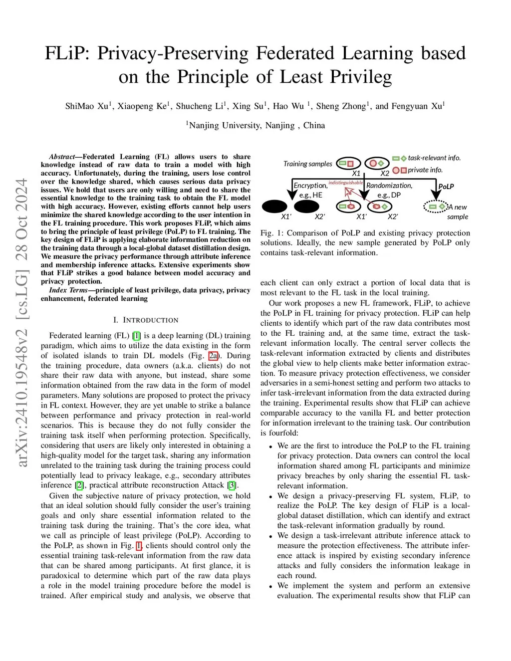 Federated Learning (FL) allows users to share knowledge instead of raw data to train a model with high accuracy. Unfortunately, during the training, users lose control over the knowledge shared, which causes serious data privacy issues. We hold that users are only willing and need to share the essential knowledge to the training task to obtain the FL model with high accuracy. However, existing efforts cannot help users minimize the shared knowledge according to the user intention in the FL training procedure. This work proposes FLiP, which aims to bring the principle of least privilege (PoLP) to FL training. The key design of FLiP is applying elaborate information reduction on the training data through a local-global dataset distillation design. We measure the privacy performance through attribute inference and membership inference attacks. Extensive experiments show that FLiP strikes a good balance between model accuracy and privacy protection.