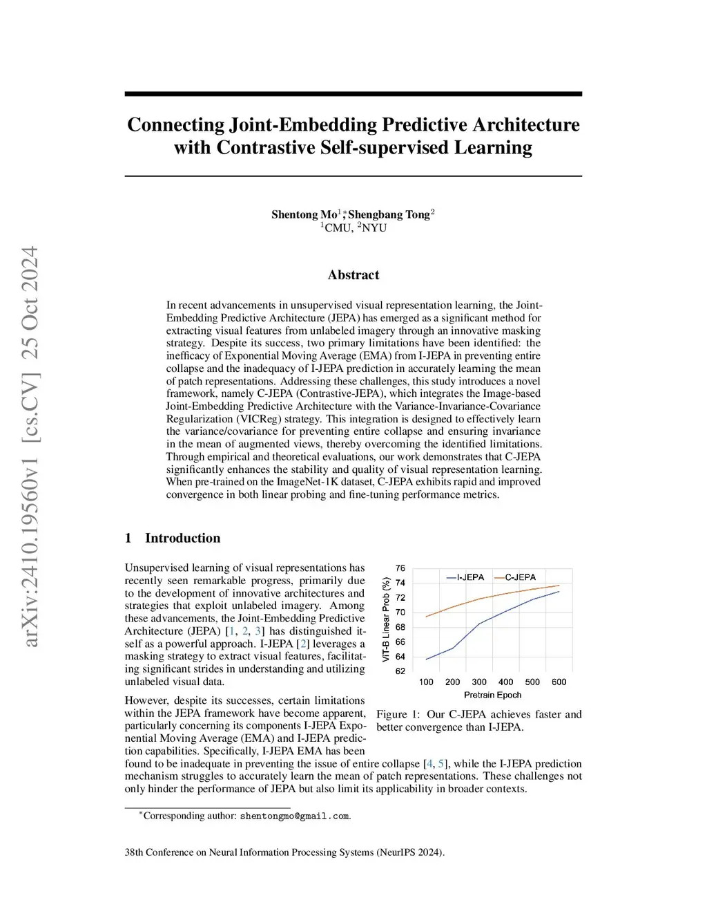 In recent advancements in unsupervised visual representation learning, the Joint-Embedding Predictive Architecture (JEPA) has emerged as a significant method for extracting visual features from unlabeled imagery through an innovative masking strategy. Despite its success, two primary limitations have been identified: the inefficacy of Exponential Moving Average (EMA) from I-JEPA in preventing entire collapse and the inadequacy of I-JEPA prediction in accurately learning the mean of patch representations. Addressing these challenges, this study introduces a novel framework, namely C-JEPA (Contrastive-JEPA), which integrates the Image-based Joint-Embedding Predictive Architecture with the Variance-Invariance-Covariance Regularization (VICReg) strategy. This integration is designed to effectively learn the variance/covariance for preventing entire collapse and ensuring invariance in the mean of augmented views, thereby overcoming the identified limitations. Through empirical and theoretical evaluations, our work demonstrates that C-JEPA significantly enhances the stability and quality of visual representation learning. When pre-trained on the ImageNet-1K dataset, C-JEPA exhibits rapid and improved convergence in both linear probing and fine-tuning performance metrics.