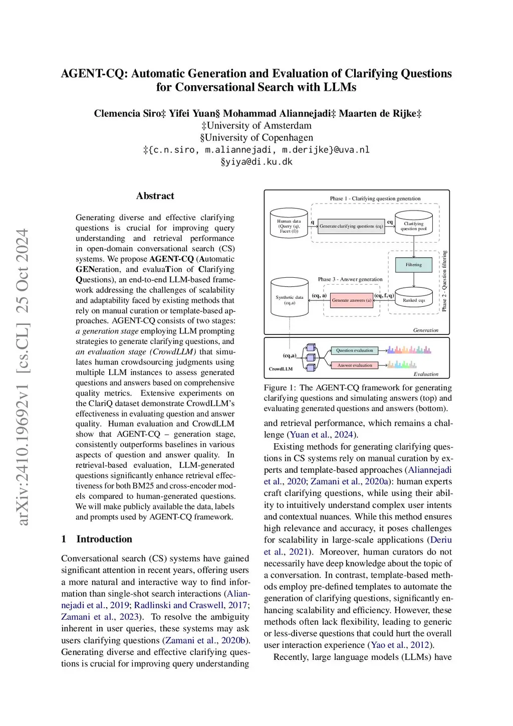 Generating diverse and effective clarifying questions is crucial for improving query understanding and retrieval performance in open-domain conversational search (CS) systems. We propose AGENT-CQ (Automatic GENeration, and evaluaTion of Clarifying Questions), an end-to-end LLM-based framework addressing the challenges of scalability and adaptability faced by existing methods that rely on manual curation or template-based approaches. AGENT-CQ consists of two stages: a generation stage employing LLM prompting strategies to generate clarifying questions, and an evaluation stage (CrowdLLM) that simulates human crowdsourcing judgments using multiple LLM instances to assess generated questions and answers based on comprehensive quality metrics. Extensive experiments on the ClariQ dataset demonstrate CrowdLLM's effectiveness in evaluating question and answer quality. Human evaluation and CrowdLLM show that the AGENT-CQ - generation stage, consistently outperforms baselines in various aspects of question and answer quality. In retrieval-based evaluation, LLM-generated questions significantly enhance retrieval effectiveness for both BM25 and cross-encoder models compared to human-generated questions.