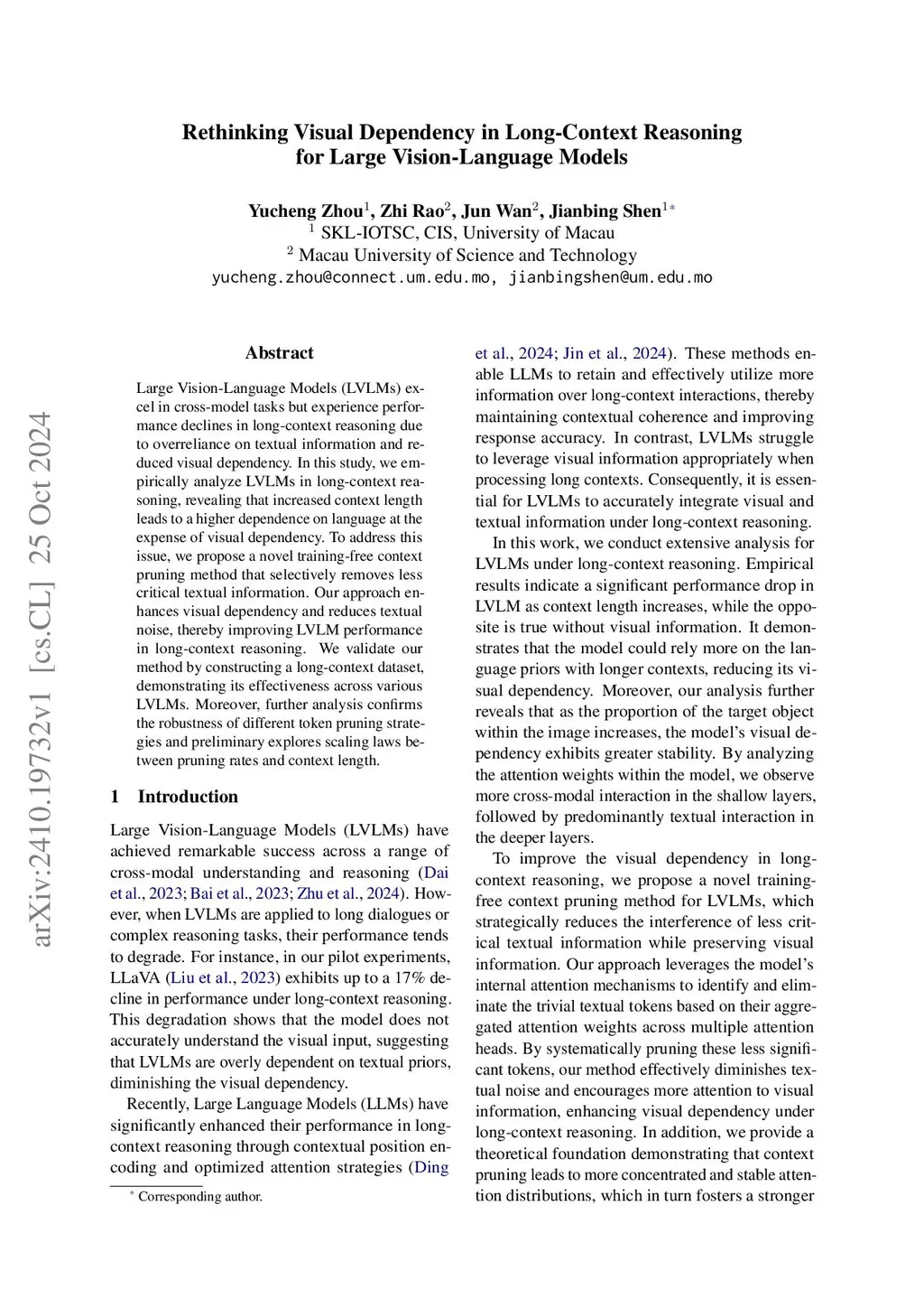Large Vision-Language Models (LVLMs) excel in cross-model tasks but experience performance declines in long-context reasoning due to overreliance on textual information and reduced visual dependency. In this study, we empirically analyze LVLMs in long-context reasoning, revealing that increased context length leads to a higher dependence on language at the expense of visual dependency. To address this issue, we propose a novel training-free context pruning method that selectively removes less critical textual information. Our approach enhances visual dependency and reduces textual noise, thereby improving LVLM performance in long-context reasoning. We validate our method by constructing a long-context dataset, demonstrating its effectiveness across various LVLMs. Moreover, further analysis confirms the robustness of different token pruning strategies and preliminary explores scaling laws between pruning rates and context length.