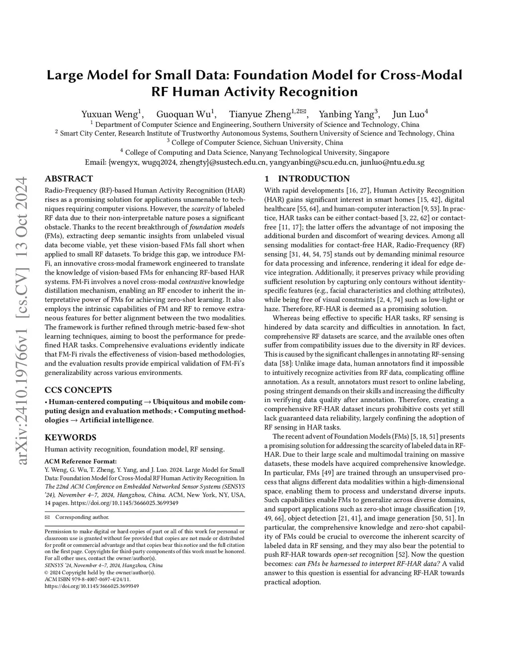 Radio-Frequency (RF)-based Human Activity Recognition (HAR) rises as a promising solution for applications unamenable to techniques requiring computer visions. However, the scarcity of labeled RF data due to their non-interpretable nature poses a significant obstacle. Thanks to the recent breakthrough of foundation models (FMs), extracting deep semantic insights from unlabeled visual data become viable, yet these vision-based FMs fall short when applied to small RF datasets. To bridge this gap, we introduce FM-Fi, an innovative cross-modal framework engineered to translate the knowledge of vision-based FMs for enhancing RF-based HAR systems. FM-Fi involves a novel cross-modal contrastive knowledge distillation mechanism, enabling an RF encoder to inherit the interpretative power of FMs for achieving zero-shot learning. It also employs the intrinsic capabilities of FM and RF to remove extraneous features for better alignment between the two modalities. The framework is further refined through metric-based few-shot learning techniques, aiming to boost the performance for predefined HAR tasks. Comprehensive evaluations evidently indicate that FM-Fi rivals the effectiveness of vision-based methodologies, and the evaluation results provide empirical validation of FM-Fi's generalizability across various environments.