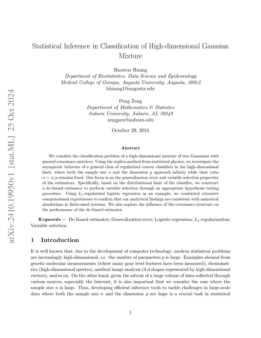 We consider the classification problem of a high-dimensional mixture of two Gaussians with general covariance matrices. Using the replica method from statistical physics, we investigate the asymptotic behavior of a general class of regularized convex classifiers in the high-dimensional limit, where both the sample size and the dimension approach infinity while their ratio remains fixed. Our focus is on the generalization error and variable selection properties of the estimators. Specifically, based on the distributional limit of the classifier, we construct a de-biased estimator to perform variable selection through an appropriate hypothesis testing procedure. Using -regularized logistic regression as an example, we conducted extensive computational experiments to confirm that our analytical findings are consistent with numerical simulations in finite-sized systems. We also explore the influence of the covariance structure on the performance of the de-biased estimator.