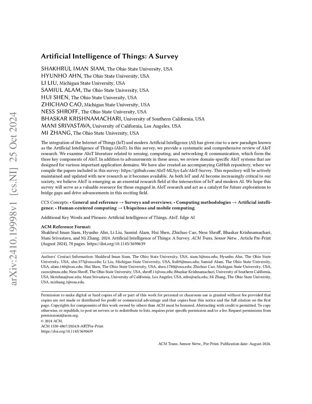 The integration of the Internet of Things (IoT) and modern Artificial Intelligence (AI) has given rise to a new paradigm known as the Artificial Intelligence of Things (AIoT). In this survey, we provide a systematic and comprehensive review of AIoT research. We examine AIoT literature related to sensing, computing, and networking & communication, which form the three key components of AIoT. In addition to advancements in these areas, we review domain-specific AIoT systems that are designed for various important application domains. We have also created an accompanying GitHub repository, where we compile the papers included in this survey: https://github.com/AIoT-MLSys-Lab/AIoT-Survey. This repository will be actively maintained and updated with new research as it becomes available. As both IoT and AI become increasingly critical to our society, we believe AIoT is emerging as an essential research field at the intersection of IoT and modern AI. We hope this survey will serve as a valuable resource for those engaged in AIoT research and act as a catalyst for future explorations to bridge gaps and drive advancements in this exciting field.