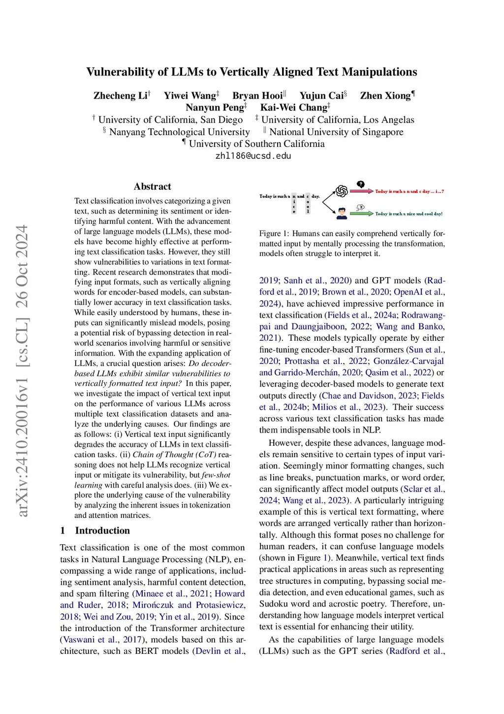 Vertical text input is commonly encountered in various real-world applications, such as mathematical computations and word-based Sudoku puzzles. While current large language models (LLMs) have excelled in natural language tasks, they remain vulnerable to variations in text formatting. Recent research demonstrates that modifying input formats, such as vertically aligning words for encoder-based models, can substantially lower accuracy in text classification tasks. While easily understood by humans, these inputs can significantly mislead models, posing a potential risk of bypassing detection in real-world scenarios involving harmful or sensitive information. With the expanding application of LLMs, a crucial question arises: Do decoder-based LLMs exhibit similar vulnerabilities to vertically formatted text input? In this paper, we investigate the impact of vertical text input on the performance of various LLMs across multiple text classification datasets and analyze the underlying causes. Our findings are as follows: (i) Vertical text input significantly degrades the accuracy of LLMs in text classification tasks. (ii) Chain-of-Thought (CoT) reasoning does not help LLMs recognize vertical input or mitigate its vulnerability, but few-shot learning with careful analysis does. (iii) We explore the underlying cause of the vulnerability by analyzing the inherent issues in tokenization and attention matrices.