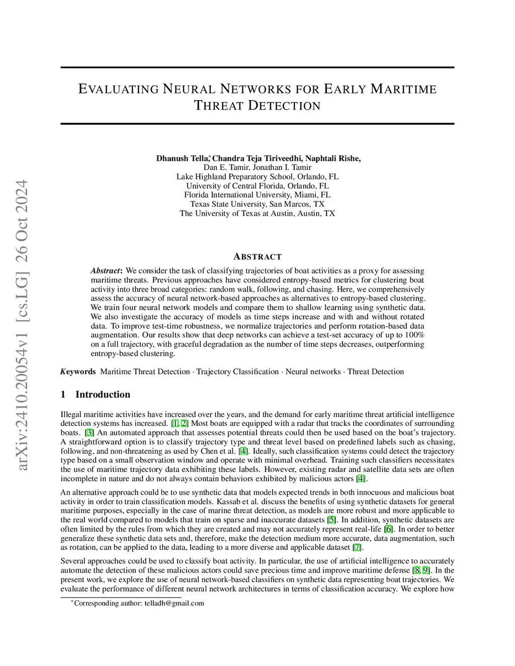 We consider the task of classifying trajectories of boat activities as a proxy for assessing maritime threats. Previous approaches have considered entropy-based metrics for clustering boat activity into three broad categories: random walk, following, and chasing. Here, we comprehensively assess the accuracy of neural network-based approaches as alternatives to entropy-based clustering. We train four neural network models and compare them to shallow learning using synthetic data. We also investigate the accuracy of models as time steps increase and with and without rotated data. To improve test-time robustness, we normalize trajectories and perform rotation-based data augmentation. Our results show that deep networks can achieve a test-set accuracy of up to 100% on a full trajectory, with graceful degradation as the number of time steps decreases, outperforming entropy-based clustering.