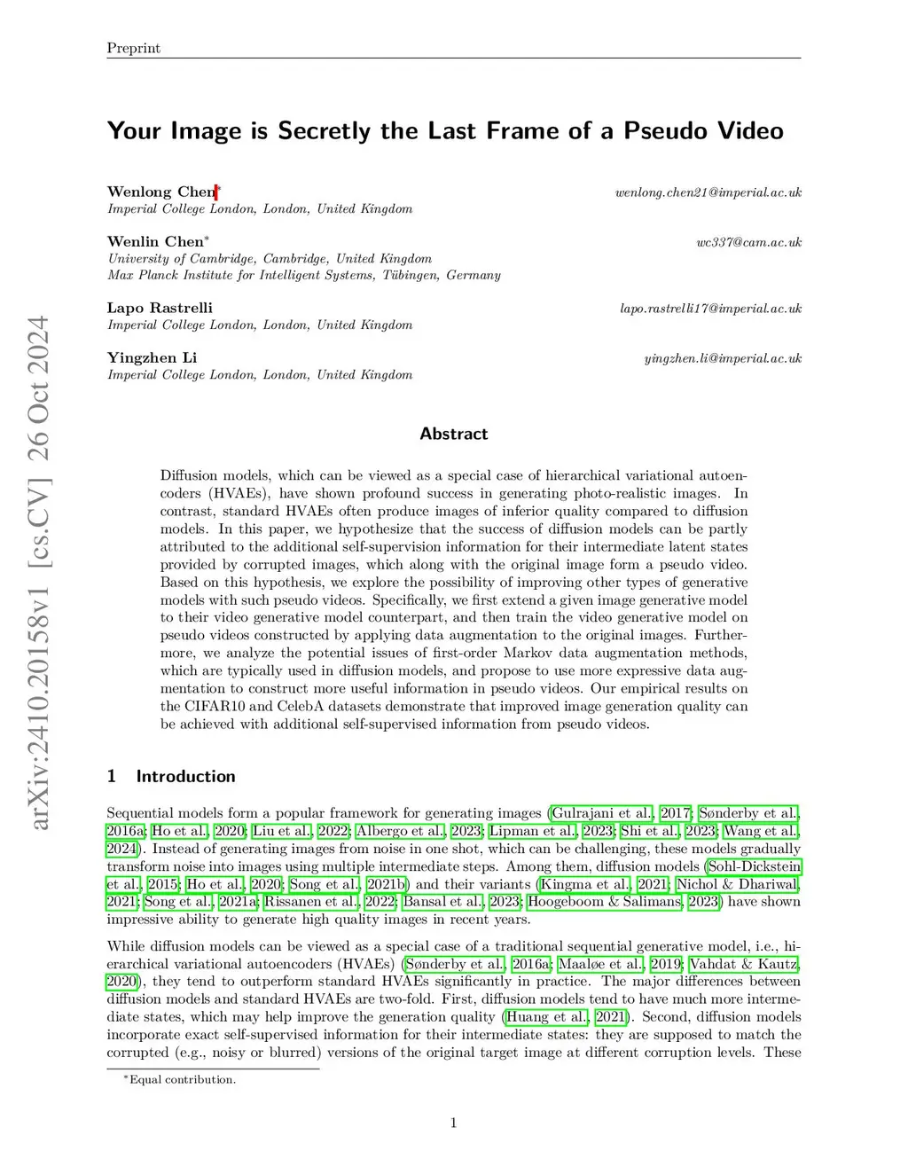 Diffusion models, which can be viewed as a special case of hierarchical variational autoencoders (HVAEs), have shown profound success in generating photo-realistic images. In contrast, standard HVAEs often produce images of inferior quality compared to diffusion models. In this paper, we hypothesize that the success of diffusion models can be partly attributed to the additional self-supervision information for their intermediate latent states provided by corrupted images, which along with the original image form a pseudo video. Based on this hypothesis, we explore the possibility of improving other types of generative models with such pseudo videos. Specifically, we first extend a given image generative model to their video generative model counterpart, and then train the video generative model on pseudo videos constructed by applying data augmentation to the original images. Furthermore, we analyze the potential issues of first-order Markov data augmentation methods, which are typically used in diffusion models, and propose to use more expressive data augmentation to construct more useful information in pseudo videos. Our empirical results on the CIFAR10 and CelebA datasets demonstrate that improved image generation quality can be achieved with additional self-supervised information from pseudo videos.