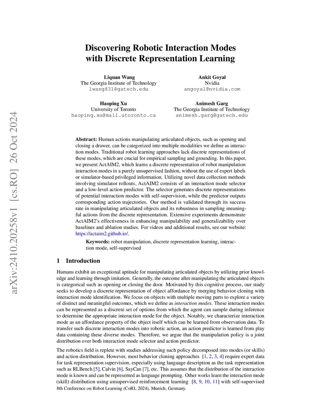 Human actions manipulating articulated objects, such as opening and closing a drawer, can be categorized into multiple modalities we define as interaction modes. Traditional robot learning approaches lack discrete representations of these modes, which are crucial for empirical sampling and grounding. In this paper, we present ActAIM2, which learns a discrete representation of robot manipulation interaction modes in a purely unsupervised fashion, without the use of expert labels or simulator-based privileged information. Utilizing novel data collection methods involving simulator rollouts, ActAIM2 consists of an interaction mode selector and a low-level action predictor. The selector generates discrete representations of potential interaction modes with self-supervision, while the predictor outputs corresponding action trajectories. Our method is validated through its success rate in manipulating articulated objects and its robustness in sampling meaningful actions from the discrete representation. Extensive experiments demonstrate ActAIM2's effectiveness in enhancing manipulability and generalizability over baselines and ablation studies. For videos and additional results, see our website: https://actaim2.github.io/.