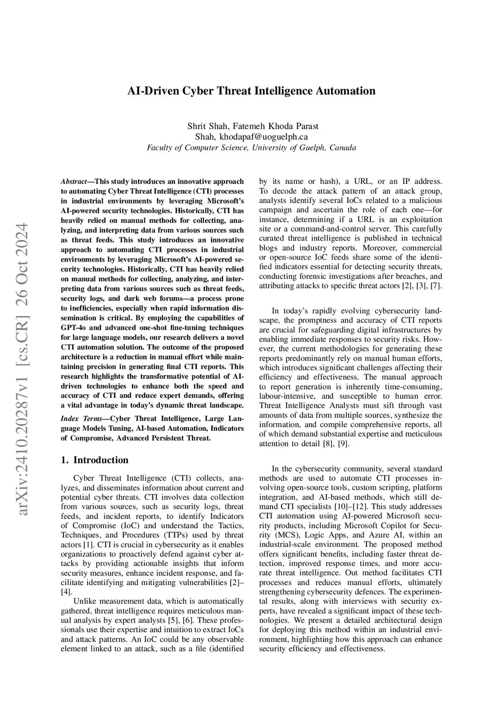 This study introduces an innovative approach to automating Cyber Threat Intelligence (CTI) processes in industrial environments by leveraging Microsoft's AI-powered security technologies. Historically, CTI has heavily relied on manual methods for collecting, analyzing, and interpreting data from various sources such as threat feeds. This study introduces an innovative approach to automating CTI processes in industrial environments by leveraging Microsoft's AI-powered security technologies. Historically, CTI has heavily relied on manual methods for collecting, analyzing, and interpreting data from various sources such as threat feeds, security logs, and dark web forums -- a process prone to inefficiencies, especially when rapid information dissemination is critical. By employing the capabilities of GPT-4o and advanced one-shot fine-tuning techniques for large language models, our research delivers a novel CTI automation solution. The outcome of the proposed architecture is a reduction in manual effort while maintaining precision in generating final CTI reports. This research highlights the transformative potential of AI-driven technologies to enhance both the speed and accuracy of CTI and reduce expert demands, offering a vital advantage in today's dynamic threat landscape.
