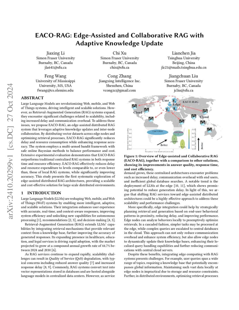 Large Language Models are revolutionizing Web, mobile, and Web of Things systems, driving intelligent and scalable solutions. However, as Retrieval-Augmented Generation (RAG) systems expand, they encounter significant challenges related to scalability, including increased delay and communication overhead. To address these issues, we propose EACO-RAG, an edge-assisted distributed RAG system that leverages adaptive knowledge updates and inter-node collaboration. By distributing vector datasets across edge nodes and optimizing retrieval processes, EACO-RAG significantly reduces delay and resource consumption while enhancing response accuracy. The system employs a multi-armed bandit framework with safe online Bayesian methods to balance performance and cost. Extensive experimental evaluation demonstrates that EACO-RAG outperforms traditional centralized RAG systems in both response time and resource efficiency. EACO-RAG effectively reduces delay and resource expenditure to levels comparable to, or even lower than, those of local RAG systems, while significantly improving accuracy. This study presents the first systematic exploration of edge-assisted distributed RAG architectures, providing a scalable and cost-effective solution for large-scale distributed environments.