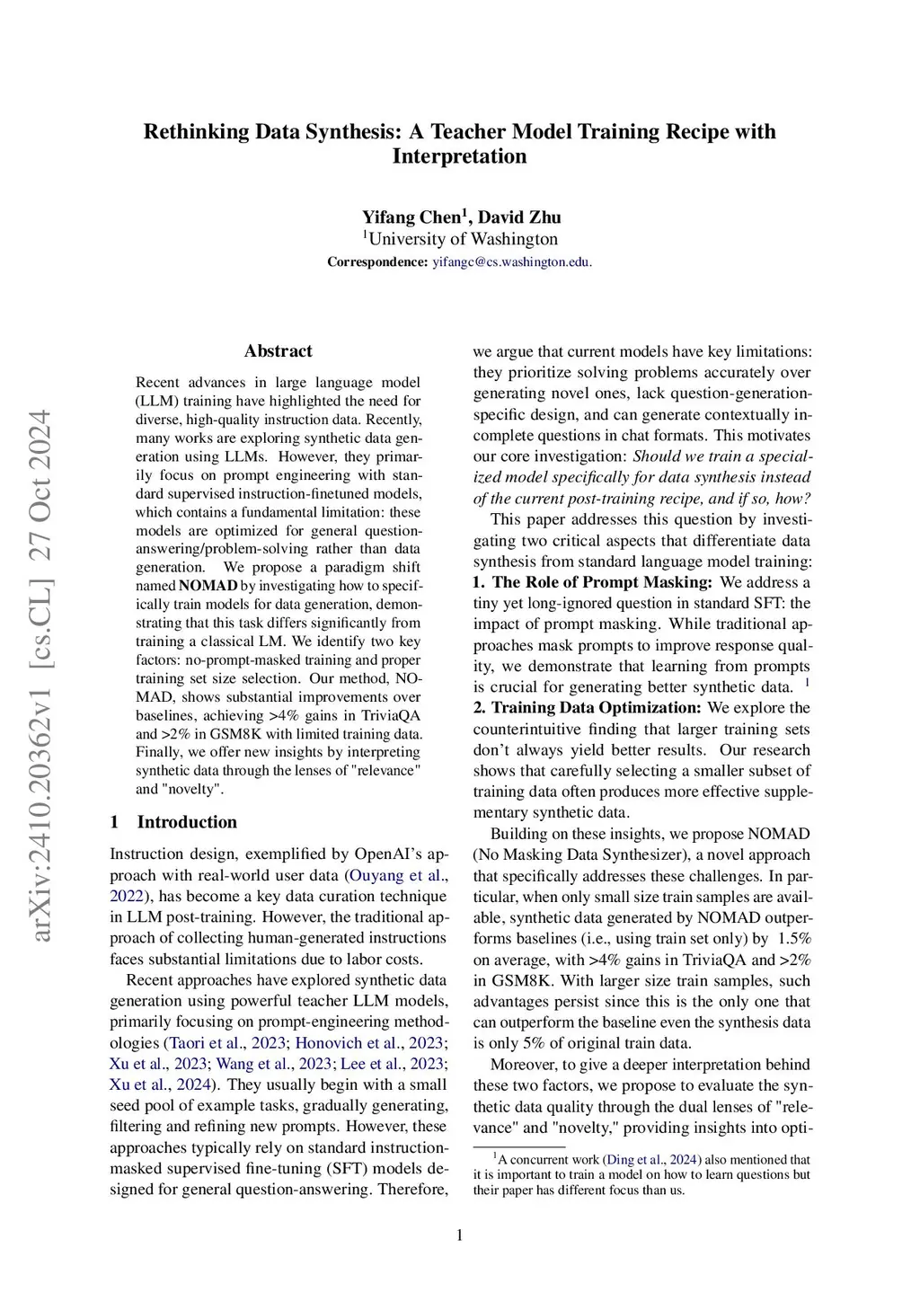 Recent advances in large language model (LLM) training have highlighted the need for diverse, high-quality instruction data. Recently, many works are exploring synthetic data generation using LLMs. However, they primarily focus on prompt engineering with standard supervised instruction-finetuned models, which contains a fundamental limitation: these models are optimized for general question-answering/problem-solving rather than data generation. We propose a paradigm shift named \textbf{NOMAD} by investigating how to specifically train models for data generation, demonstrating that this task differs significantly from training a classical LM. We identify two key factors: no-prompt-masked training and proper training set size selection. Our method, NOMAD, shows substantial improvements over baselines, achieving >4\% gains in TriviaQA and >2\% in GSM8K with limited training data. Finally, we offer new insights by interpreting synthetic data through the lenses of "relevance" and "novelty".