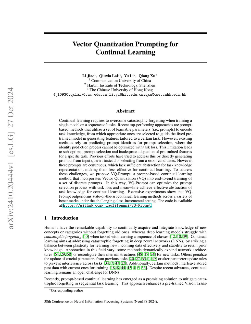 Vector Quantization Prompting for Continual Learning