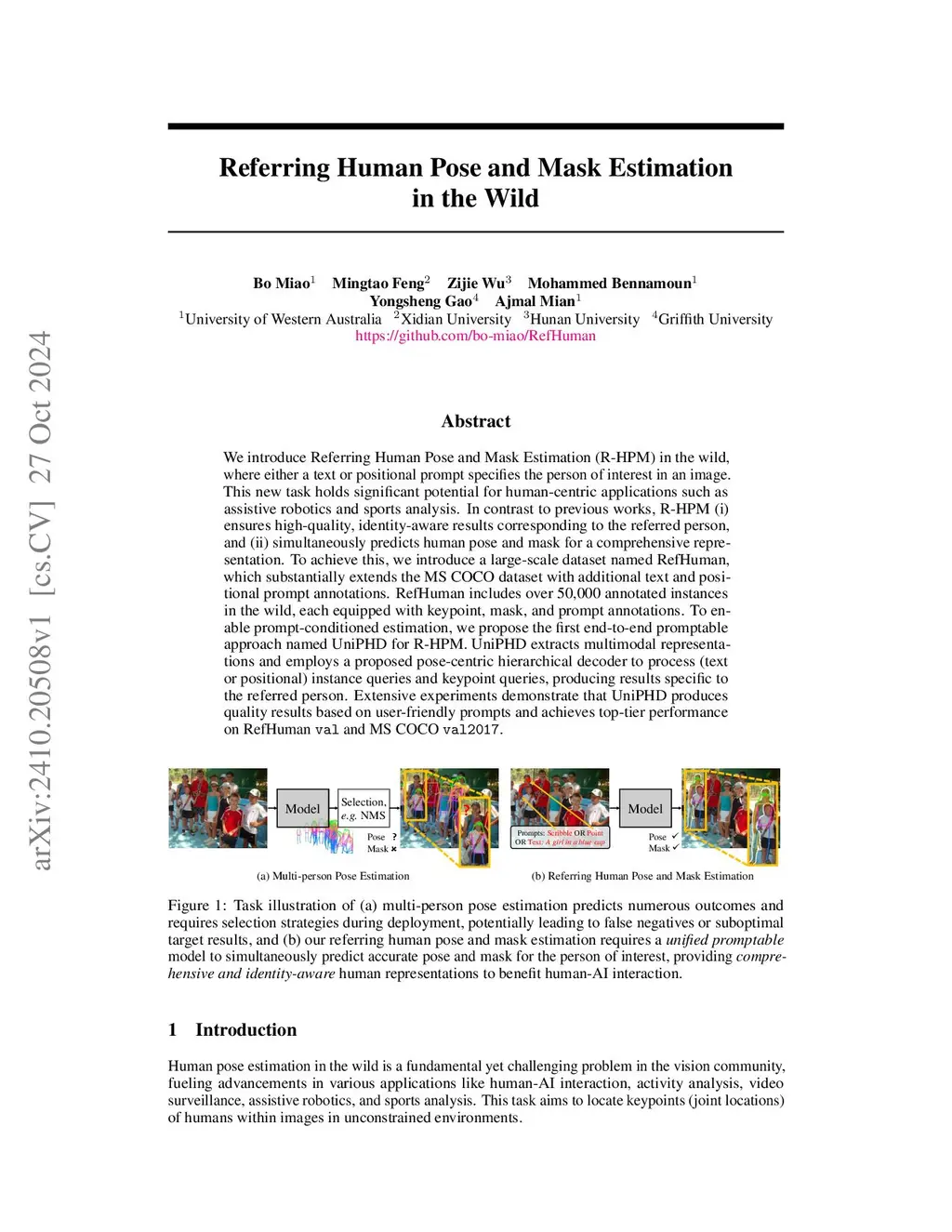 We introduce Referring Human Pose and Mask Estimation (R-HPM) in the wild, where either a text or positional prompt specifies the person of interest in an image. This new task holds significant potential for human-centric applications such as assistive robotics and sports analysis. In contrast to previous works, R-HPM (i) ensures high-quality, identity-aware results corresponding to the referred person, and (ii) simultaneously predicts human pose and mask for a comprehensive representation. To achieve this, we introduce a large-scale dataset named RefHuman, which substantially extends the MS COCO dataset with additional text and positional prompt annotations. RefHuman includes over 50,000 annotated instances in the wild, each equipped with keypoint, mask, and prompt annotations. To enable prompt-conditioned estimation, we propose the first end-to-end promptable approach named UniPHD for R-HPM. UniPHD extracts multimodal representations and employs a proposed pose-centric hierarchical decoder to process (text or positional) instance queries and keypoint queries, producing results specific to the referred person. Extensive experiments demonstrate that UniPHD produces quality results based on user-friendly prompts and achieves top-tier performance on RefHuman val and MS COCO val2017. Data and Code: https://github.com/bo-miao/RefHuman