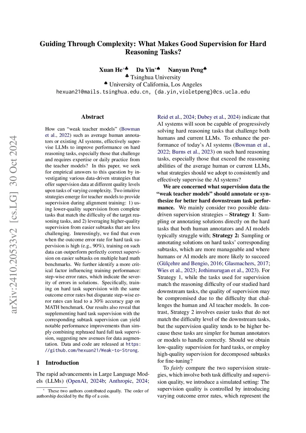 How can "weak teacher models" such as average human annotators or existing AI systems, effectively supervise LLMs to improve performance on hard reasoning tasks, especially those that challenge and requires expertise or daily practice from the teacher models? In this paper, we seek for empirical answers to this question by investigating various data-driven strategies that offer supervision data at different quality levels upon tasks of varying complexity. Two intuitive strategies emerge for teacher models to provide supervision during alignment training: 1) using lower-quality supervision from complete tasks that match the difficulty of the target reasoning tasks, and 2) leveraging higher-quality supervision from easier subtasks that are less challenging. Interestingly, we find that even when the outcome error rate for hard task supervision is high (e.g., 90\%), training on such data can outperform perfectly correct supervision of easier subtasks on multiple hard math benchmarks. We further identify a more critical factor influencing training performance: step-wise error rates, which indicate the severity of errors in solutions. Specifically, training on hard task supervision with the same outcome error rates but disparate step-wise error rates can lead to a 30\% accuracy gap on MATH benchmark. Our results also reveal that supplementing hard task supervision with the corresponding subtask supervision can yield notable performance improvements than simply combining rephrased hard full task supervision, suggesting new avenues for data augmentation. Data and code are released atthis https URL.