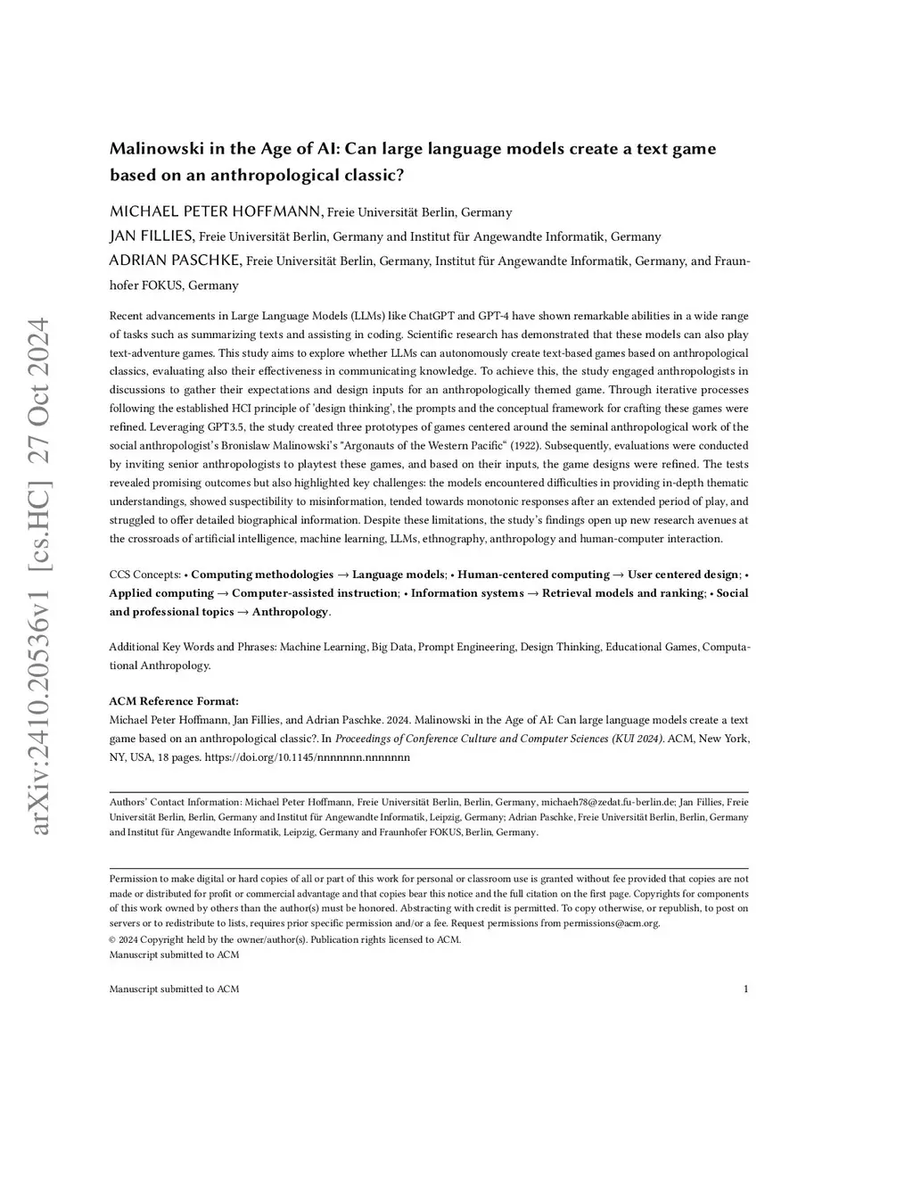 Recent advancements in Large Language Models (LLMs) like ChatGPT and GPT-4 have shown remarkable abilities in a wide range of tasks such as summarizing texts and assisting in coding. Scientific research has demonstrated that these models can also play text-adventure games. This study aims to explore whether LLMs can autonomously create text-based games based on anthropological classics, evaluating also their effectiveness in communicating knowledge. To achieve this, the study engaged anthropologists in discussions to gather their expectations and design inputs for an anthropologically themed game. Through iterative processes following the established HCI principle of 'design thinking', the prompts and the conceptual framework for crafting these games were refined. Leveraging GPT3.5, the study created three prototypes of games centered around the seminal anthropological work of the social anthropologist's Bronislaw Malinowski's "Argonauts of the Western Pacific" (1922). Subsequently, evaluations were conducted by inviting senior anthropologists to playtest these games, and based on their inputs, the game designs were refined. The tests revealed promising outcomes but also highlighted key challenges: the models encountered difficulties in providing in-depth thematic understandings, showed suspectibility to misinformation, tended towards monotonic responses after an extended period of play, and struggled to offer detailed biographical information. Despite these limitations, the study's findings open up new research avenues at the crossroads of artificial intelligence, machine learning, LLMs, ethnography, anthropology and human-computer interaction.