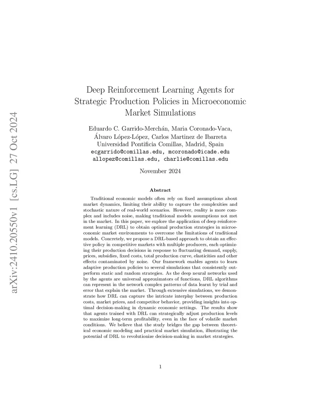 Traditional economic models often rely on fixed assumptions about market dynamics, limiting their ability to capture the complexities and stochastic nature of real-world scenarios. However, reality is more complex and includes noise, making traditional models assumptions not met in the market. In this paper, we explore the application of deep reinforcement learning (DRL) to obtain optimal production strategies in microeconomic market environments to overcome the limitations of traditional models. Concretely, we propose a DRL-based approach to obtain an effective policy in competitive markets with multiple producers, each optimizing their production decisions in response to fluctuating demand, supply, prices, subsidies, fixed costs, total production curve, elasticities and other effects contaminated by noise. Our framework enables agents to learn adaptive production policies to several simulations that consistently outperform static and random strategies. As the deep neural networks used by the agents are universal approximators of functions, DRL algorithms can represent in the network complex patterns of data learnt by trial and error that explain the market. Through extensive simulations, we demonstrate how DRL can capture the intricate interplay between production costs, market prices, and competitor behavior, providing insights into optimal decision-making in dynamic economic settings. The results show that agents trained with DRL can strategically adjust production levels to maximize long-term profitability, even in the face of volatile market conditions. We believe that the study bridges the gap between theoretical economic modeling and practical market simulation, illustrating the potential of DRL to revolutionize decision-making in market strategies.