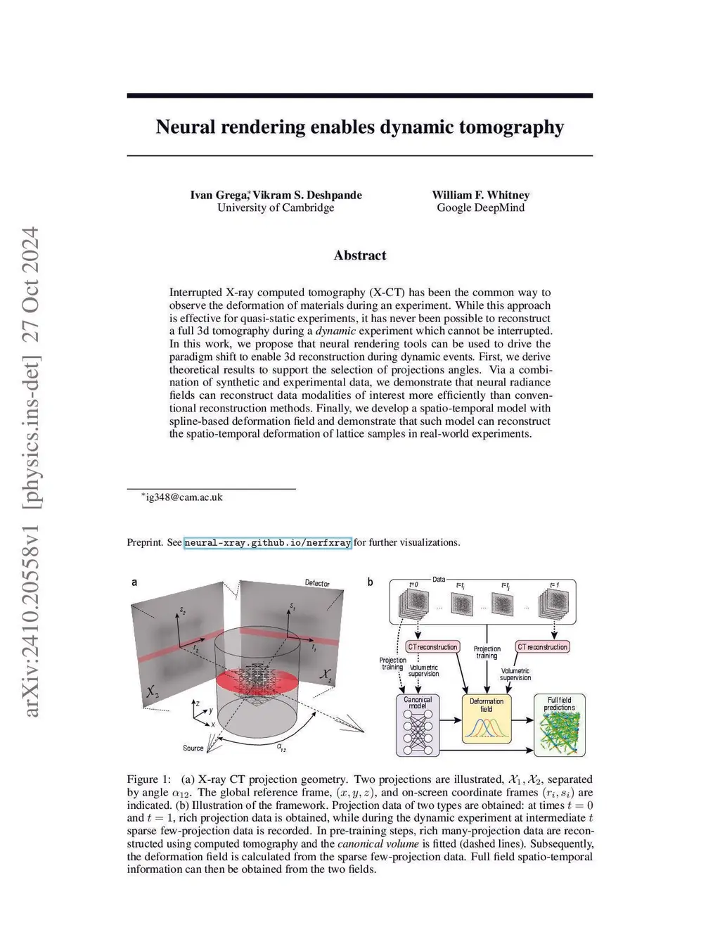 Interrupted X-ray computed tomography (X-CT) has been the common way to observe the deformation of materials during an experiment. While this approach is effective for quasi-static experiments, it has never been possible to reconstruct a full 3d tomography during a dynamic experiment which cannot be interrupted. In this work, we propose that neural rendering tools can be used to drive the paradigm shift to enable 3d reconstruction during dynamic events. First, we derive theoretical results to support the selection of projections angles. Via a combination of synthetic and experimental data, we demonstrate that neural radiance fields can reconstruct data modalities of interest more efficiently than conventional reconstruction methods. Finally, we develop a spatio-temporal model with spline-based deformation field and demonstrate that such model can reconstruct the spatio-temporal deformation of lattice samples in real-world experiments.