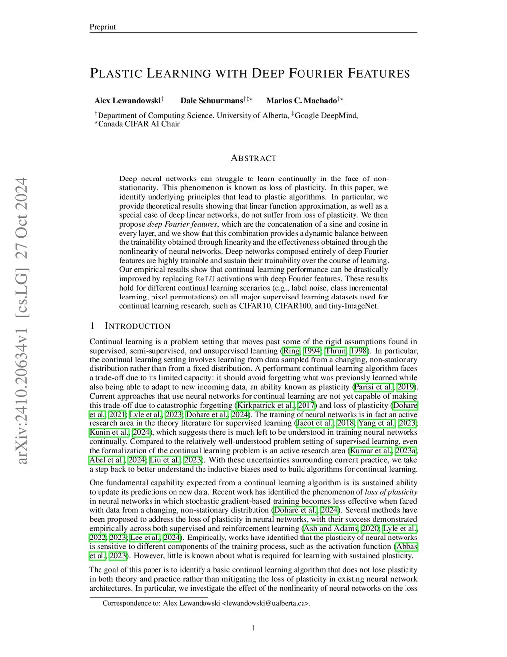 Deep neural networks can struggle to learn continually in the face of non-stationarity. This phenomenon is known as loss of plasticity. In this paper, we identify underlying principles that lead to plastic algorithms. In particular, we provide theoretical results showing that linear function approximation, as well as a special case of deep linear networks, do not suffer from loss of plasticity. We then propose deep Fourier features, which are the concatenation of a sine and cosine in every layer, and we show that this combination provides a dynamic balance between the trainability obtained through linearity and the effectiveness obtained through the nonlinearity of neural networks. Deep networks composed entirely of deep Fourier features are highly trainable and sustain their trainability over the course of learning. Our empirical results show that continual learning performance can be drastically improved by replacing ReLU activations with deep Fourier features. These results hold for different continual learning scenarios (e.g., label noise, class incremental learning, pixel permutations) on all major supervised learning datasets used for continual learning research, such as CIFAR10, CIFAR100, and tiny-ImageNet.