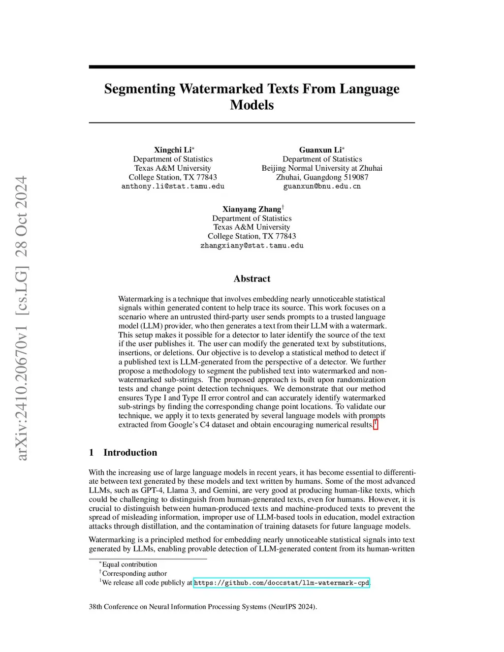 Watermarking is a technique that involves embedding nearly unnoticeable statistical signals within generated content to help trace its source. This work focuses on a scenario where an untrusted third-party user sends prompts to a trusted language model (LLM) provider, who then generates a text from their LLM with a watermark. This setup makes it possible for a detector to later identify the source of the text if the user publishes it. The user can modify the generated text by substitutions, insertions, or deletions. Our objective is to develop a statistical method to detect if a published text is LLM-generated from the perspective of a detector. We further propose a methodology to segment the published text into watermarked and non-watermarked sub-strings. The proposed approach is built upon randomization tests and change point detection techniques. We demonstrate that our method ensures Type I and Type II error control and can accurately identify watermarked sub-strings by finding the corresponding change point locations. To validate our technique, we apply it to texts generated by several language models with prompts extracted from Google's C4 dataset and obtain encouraging numerical results. We release all code publicly at https://github.com/doccstat/llm-watermark-cpd.