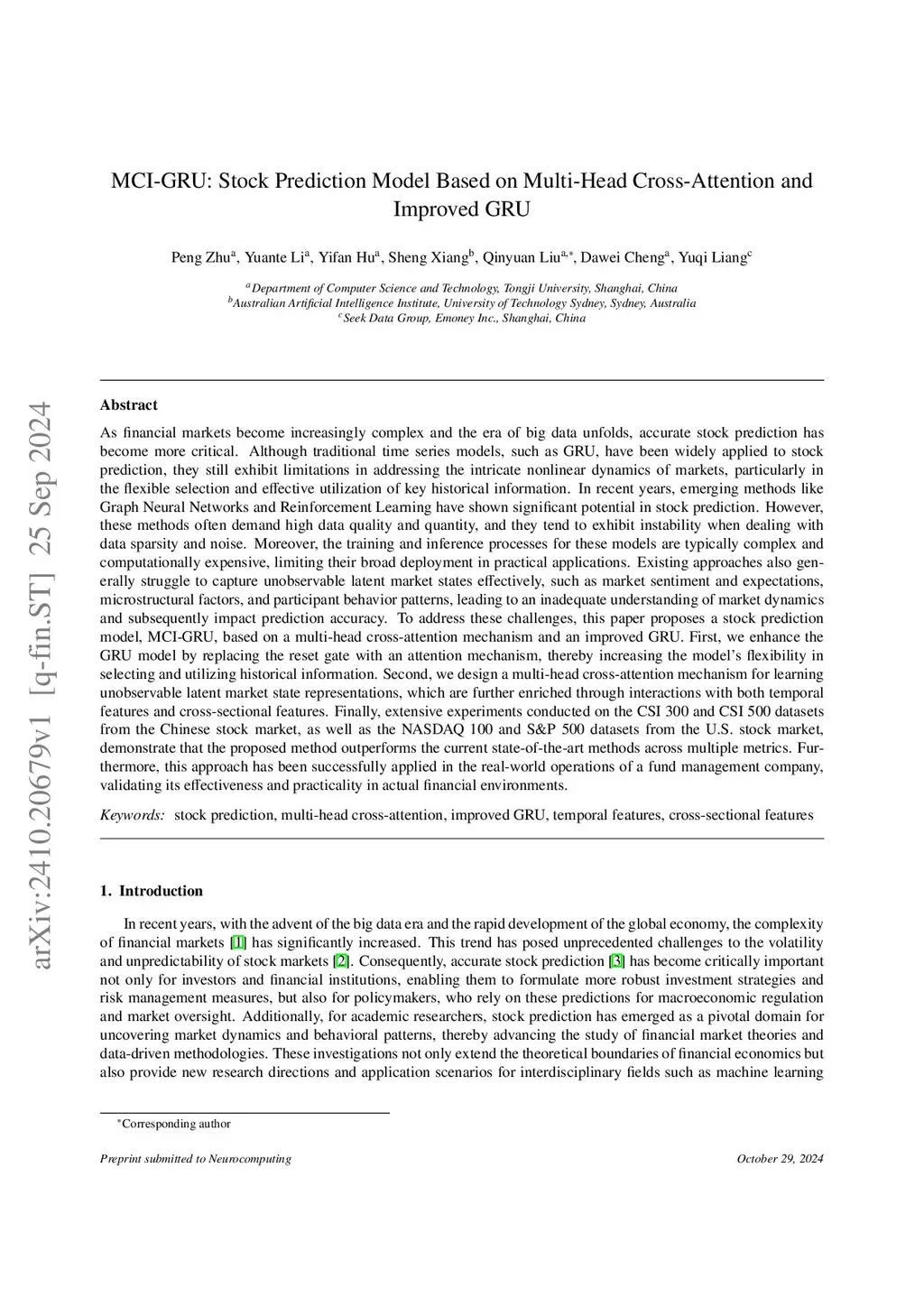 MCI-GRU: Stock Prediction Model Based on Multi-Head Cross-Attention and Improved GRU