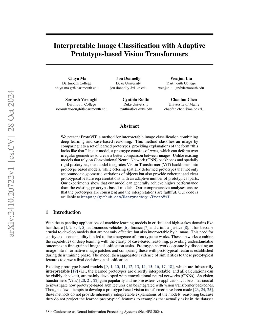 We present ProtoViT, a method for interpretable image classification combining deep learning and case-based reasoning. This method classifies an image by comparing it to a set of learned prototypes, providing explanations of the form ``this looks like that.'' In our model, a prototype consists of \textit{parts}, which can deform over irregular geometries to create a better comparison between images. Unlike existing models that rely on Convolutional Neural Network (CNN) backbones and spatially rigid prototypes, our model integrates Vision Transformer (ViT) backbones into prototype based models, while offering spatially deformed prototypes that not only accommodate geometric variations of objects but also provide coherent and clear prototypical feature representations with an adaptive number of prototypical parts. Our experiments show that our model can generally achieve higher performance than the existing prototype based models. Our comprehensive analyses ensure that the prototypes are consistent and the interpretations are faithful.