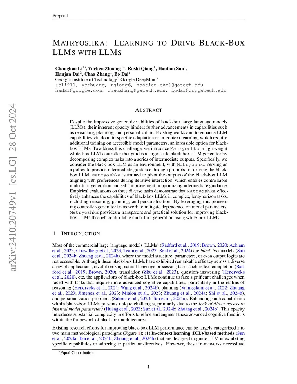 Despite the impressive generative abilities of black-box large language models (LLMs), their inherent opacity hinders further advancements in capabilities such as reasoning, planning, and personalization. Existing works aim to enhance LLM capabilities via domain-specific adaptation, which require additional training on accessible model parameters, an infeasible option for black-box LLMs. To address this challenge, we introduce Matryoshka Pilot (M-Pilot), a lightweight white-box LLM controller that guides a large-scale black-box LLM generator by decomposing complex tasks into a series of intermediate outputs. Specifically, we consider the black-box LLM as an environment, with M-Pilot serving as a policy to provide intermediate guidance through prompts for driving the black-box LLM. M-Pilot is trained to pivot the outputs of the black-box LLM aligning with preferences during iterative interaction, which enables controllable multi-turn generation and self-improvement in optimizing intermediate guidance. Empirical evaluations on diverse tasks demonstrate that our method effectively enhances the capabilities of black-box LLMs in complex, long-horizon tasks. Our code is publicly available at:this https URL.