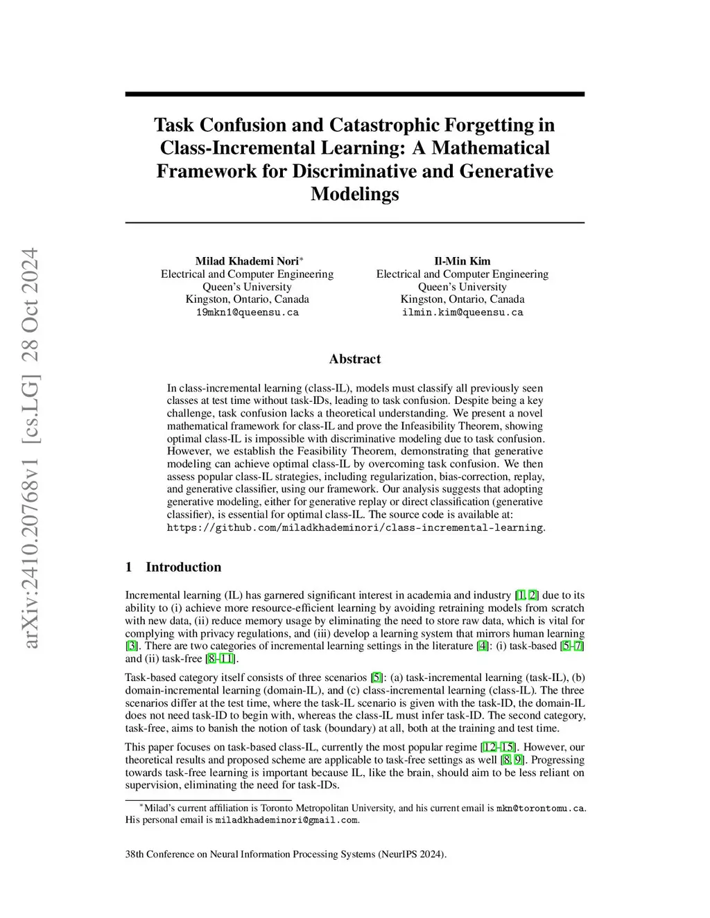 In class-incremental learning (class-IL), models must classify all previously seen classes at test time without task-IDs, leading to task confusion. Despite being a key challenge, task confusion lacks a theoretical understanding. We present a novel mathematical framework for class-IL and prove the Infeasibility Theorem, showing optimal class-IL is impossible with discriminative modeling due to task confusion. However, we establish the Feasibility Theorem, demonstrating that generative modeling can achieve optimal class-IL by overcoming task confusion. We then assess popular class-IL strategies, including regularization, bias-correction, replay, and generative classifier, using our framework. Our analysis suggests that adopting generative modeling, either for generative replay or direct classification (generative classifier), is essential for optimal class-IL.