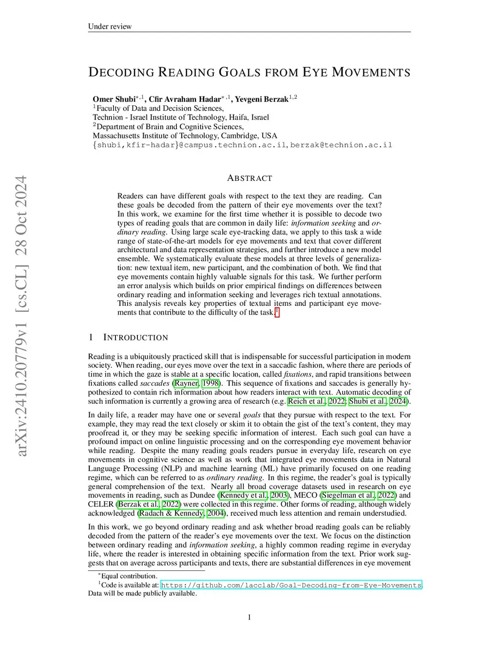 Readers can have different goals with respect to the text that they are reading. Can these goals be decoded from their eye movements over the text? In this work, we examine for the first time whether it is possible to distinguish between two types of common reading goals: information seeking and ordinary reading for comprehension. Using large-scale eye tracking data, we address this task with a wide range of models that cover different architectural and data representation strategies, and further introduce a new model ensemble. We find that transformer-based models with scanpath representations coupled with language modeling solve it most successfully, and that accurate predictions can be made in real time, long before the participant finished reading the text. We further introduce a new method for model performance analysis based on mixed effect modeling. Combining this method with rich textual annotations reveals key properties of textual items and participants that contribute to the difficulty of the task, and improves our understanding of the variability in eye movement patterns across the two reading regimes.