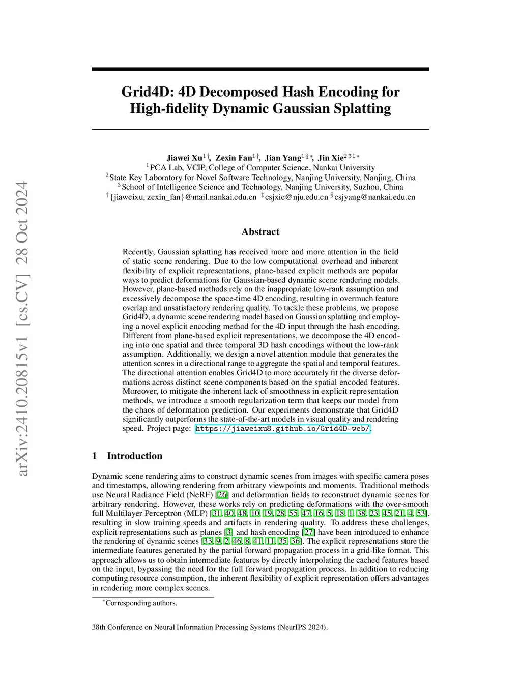 Recently, Gaussian splatting has received more and more attention in the field of static scene rendering. Due to the low computational overhead and inherent flexibility of explicit representations, plane-based explicit methods are popular ways to predict deformations for Gaussian-based dynamic scene rendering models. However, plane-based methods rely on the inappropriate low-rank assumption and excessively decompose the space-time 4D encoding, resulting in overmuch feature overlap and unsatisfactory rendering quality. To tackle these problems, we propose Grid4D, a dynamic scene rendering model based on Gaussian splatting and employing a novel explicit encoding method for the 4D input through the hash encoding. Different from plane-based explicit representations, we decompose the 4D encoding into one spatial and three temporal 3D hash encodings without the low-rank assumption. Additionally, we design a novel attention module that generates the attention scores in a directional range to aggregate the spatial and temporal features. The directional attention enables Grid4D to more accurately fit the diverse deformations across distinct scene components based on the spatial encoded features. Moreover, to mitigate the inherent lack of smoothness in explicit representation methods, we introduce a smooth regularization term that keeps our model from the chaos of deformation prediction. Our experiments demonstrate that Grid4D significantly outperforms the state-of-the-art models in visual quality and rendering speed.