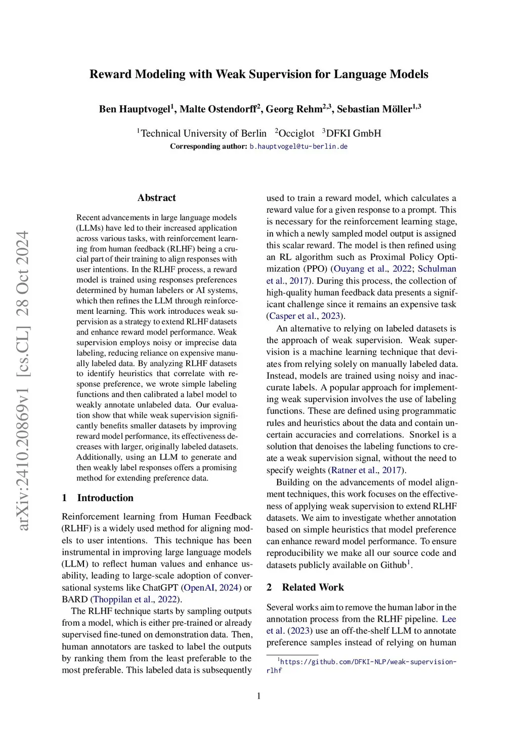 Reward Modeling with Weak Supervision for Language Models