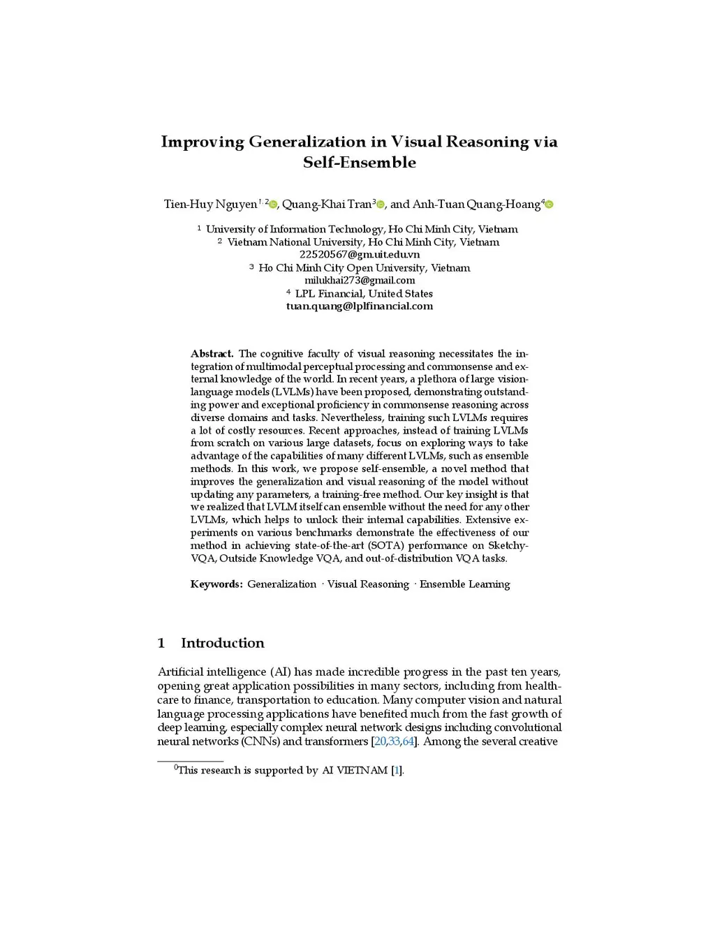 The cognitive faculty of visual reasoning necessitates the integration of multimodal perceptual processing and commonsense and external knowledge of the world. In recent years, a plethora of large vision-language models (LVLMs) have been proposed, demonstrating outstanding power and exceptional proficiency in commonsense reasoning across diverse domains and tasks. Nevertheless, training such LVLMs requires a lot of costly resources. Recent approaches, instead of training LVLMs from scratch on various large datasets, focus on exploring ways to take advantage of the capabilities of many different LVLMs, such as ensemble methods. In this work, we propose self-ensemble, a novel method that improves the generalization and visual reasoning of the model without updating any parameters, a training-free method. Our key insight is that we realized that LVLM itself can ensemble without the need for any other LVLMs, which helps to unlock their internal capabilities. Extensive experiments on various benchmarks demonstrate the effectiveness of our method in achieving state-of-the-art (SOTA) performance on SketchyVQA, Outside Knowledge VQA, and out-of-distribution VQA tasks.