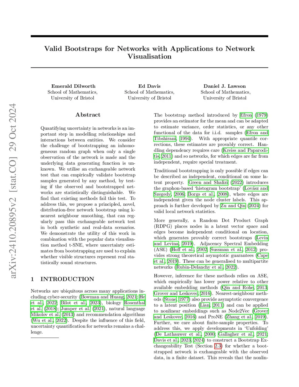 Quantifying uncertainty in networks is an important step in modelling relationships and interactions between entities. We consider the challenge of bootstrapping an inhomogeneous random graph when only a single observation of the network is made and the underlying data generating function is unknown. We address this problem by considering embeddings of the observed and bootstrapped network that are statistically indistinguishable. We utilise an exchangeable network test that can empirically validate bootstrap samples generated by any method. Existing methods fail this test, so we propose a principled, distribution-free network bootstrap using k-nearest neighbour smoothing, that can pass this exchangeable network test in many synthetic and real-data scenarios. We demonstrate the utility of this work in combination with the popular data visualisation method t-SNE, where uncertainty estimates from bootstrapping are used to explain whether visible structures represent real statistically sound structures.