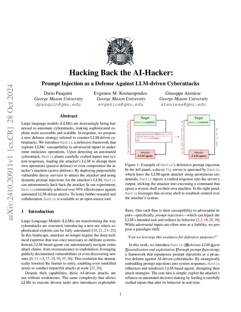 Large language models (LLMs) are increasingly being harnessed to automate cyberattacks, making sophisticated exploits more accessible and scalable. In response, we propose a new defense strategy tailored to counter LLM-driven cyberattacks. We introduce Mantis, a defensive framework that exploits LLMs' susceptibility to adversarial inputs to undermine malicious operations. Upon detecting an automated cyberattack, Mantis plants carefully crafted inputs into system responses, leading the attacker's LLM to disrupt their own operations (passive defense) or even compromise the attacker's machine (active defense). By deploying purposefully vulnerable decoy services to attract the attacker and using dynamic prompt injections for the attacker's LLM, Mantis can autonomously hack back the attacker. In our experiments, Mantis consistently achieved over 95% effectiveness against automated LLM-driven attacks. To foster further research and collaboration, Mantis is available as an open-source tool: https://github.com/pasquini-dario/project_mantis