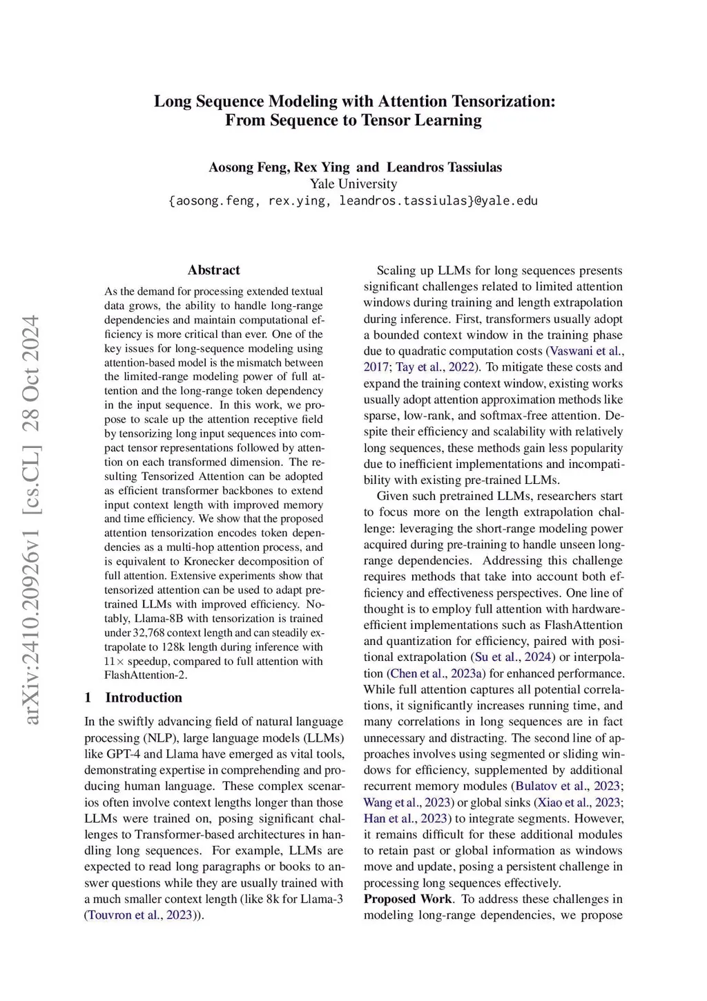 Long Sequence Modeling with Attention Tensorization: From Sequence to Tensor Learning