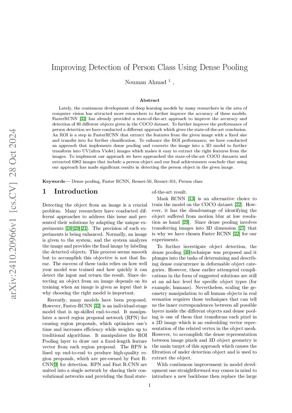 Lately, the continuous development of deep learning models by many researchers in the area of computer vision has attracted more researchers to further improve the accuracy of these models. FasterRCNN [32] has already provided a state-of-the-art approach to improve the accuracy and detection of 80 different objects given in the COCO dataset. To further improve the performance of person detection we have conducted a different approach which gives the state-of-the-art conclusion. An ROI is a step in FasterRCNN that extract the features from the given image with a fixed size and transfer into for further classification. To enhance the ROI performance, we have conducted an approach that implements dense pooling and converts the image into a 3D model to further transform into UV(ultra Violet) images which makes it easy to extract the right features from the images. To implement our approach we have approached the state-of-the-art COCO datasets and extracted 6982 images that include a person object and our final achievements conclude that using our approach has made significant results in detecting the person object in the given image