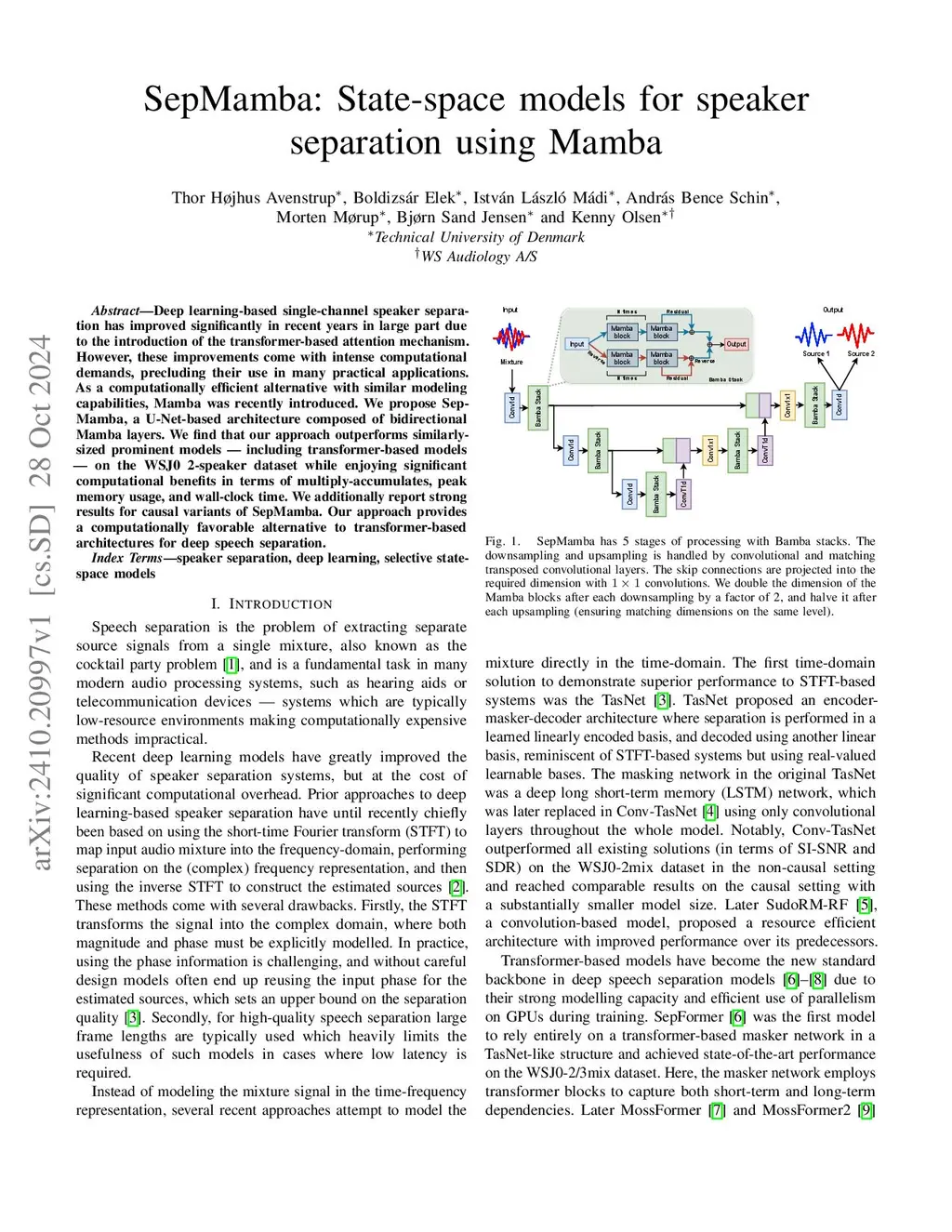 Deep learning-based single-channel speaker separation has improved significantly in recent years largely due to the introduction of the transformer-based attention mechanism. However, these improvements come at the expense of intense computational demands, precluding their use in many practical applications. As a computationally efficient alternative with similar modeling capabilities, Mamba was recently introduced. We propose SepMamba, a U-Net-based architecture composed primarily of bidirectional Mamba layers. We find that our approach outperforms similarly-sized prominent models - including transformer-based models - on the WSJ0 2-speaker dataset while enjoying a significant reduction in computational cost, memory usage, and forward pass time. We additionally report strong results for causal variants of SepMamba. Our approach provides a computationally favorable alternative to transformer-based architectures for deep speech separation.