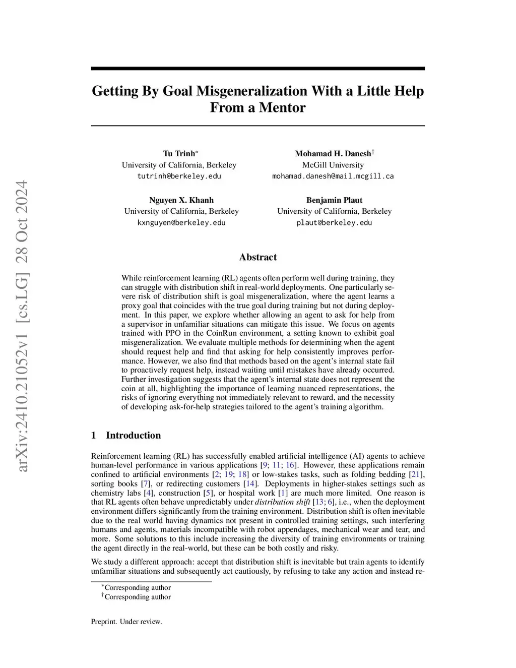 While reinforcement learning (RL) agents often perform well during training, they can struggle with distribution shift in real-world deployments. One particularly severe risk of distribution shift is goal misgeneralization, where the agent learns a proxy goal that coincides with the true goal during training but not during deployment. In this paper, we explore whether allowing an agent to ask for help from a supervisor in unfamiliar situations can mitigate this issue. We focus on agents trained with PPO in the CoinRun environment, a setting known to exhibit goal misgeneralization. We evaluate multiple methods for determining when the agent should request help and find that asking for help consistently improves performance. However, we also find that methods based on the agent's internal state fail to proactively request help, instead waiting until mistakes have already occurred. Further investigation suggests that the agent's internal state does not represent the coin at all, highlighting the importance of learning nuanced representations, the risks of ignoring everything not immediately relevant to reward, and the necessity of developing ask-for-help strategies tailored to the agent's training algorithm.