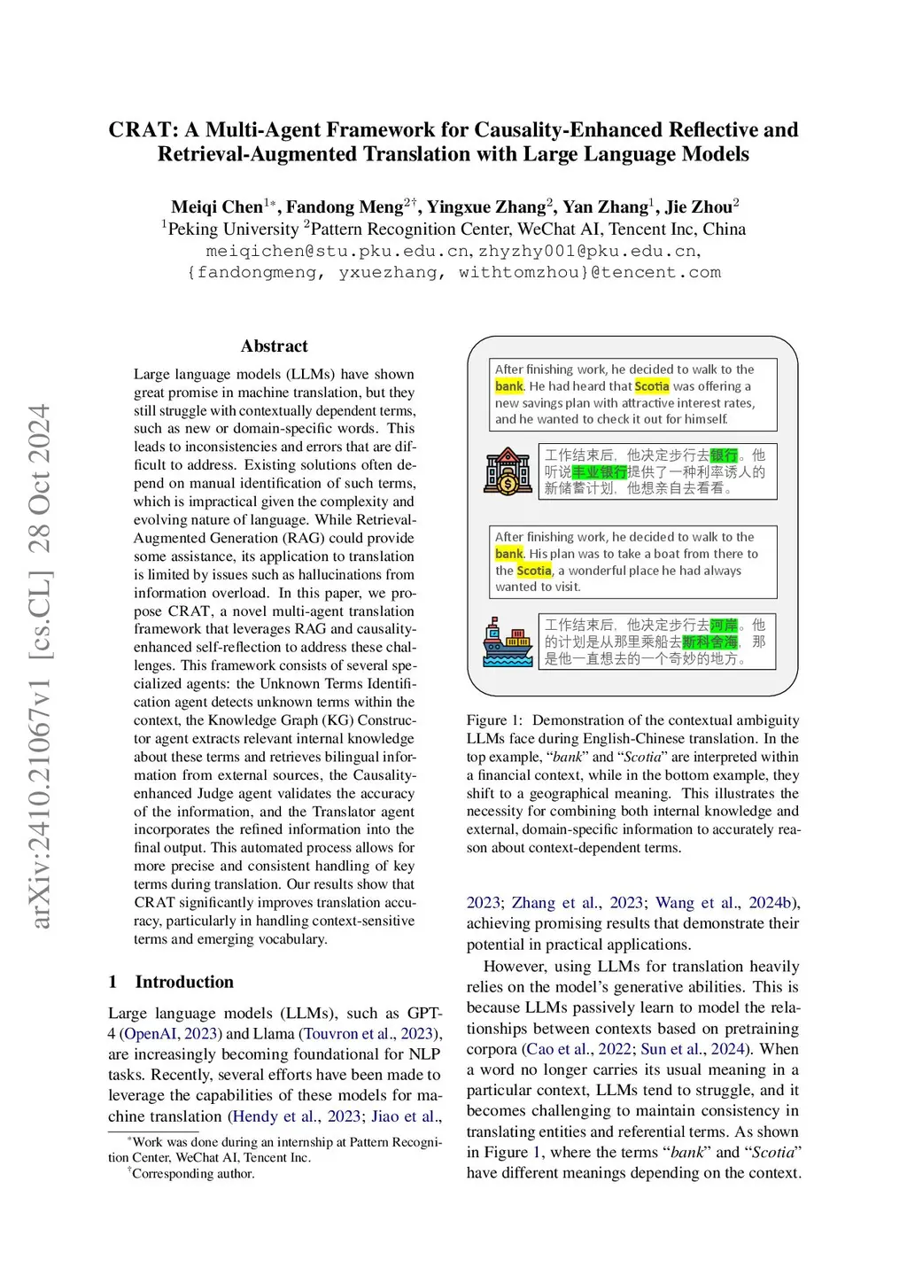 Large language models (LLMs) have shown great promise in machine translation, but they still struggle with contextually dependent terms, such as new or domain-specific words. This leads to inconsistencies and errors that are difficult to address. Existing solutions often depend on manual identification of such terms, which is impractical given the complexity and evolving nature of language. While Retrieval-Augmented Generation (RAG) could provide some assistance, its application to translation is limited by issues such as hallucinations from information overload. In this paper, we propose CRAT, a novel multi-agent translation framework that leverages RAG and causality-enhanced self-reflection to address these challenges. This framework consists of several specialized agents: the Unknown Terms Identification agent detects unknown terms within the context, the Knowledge Graph (KG) Constructor agent extracts relevant internal knowledge about these terms and retrieves bilingual information from external sources, the Causality-enhanced Judge agent validates the accuracy of the information, and the Translator agent incorporates the refined information into the final output. This automated process allows for more precise and consistent handling of key terms during translation. Our results show that CRAT significantly improves translation accuracy, particularly in handling context-sensitive terms and emerging vocabulary.