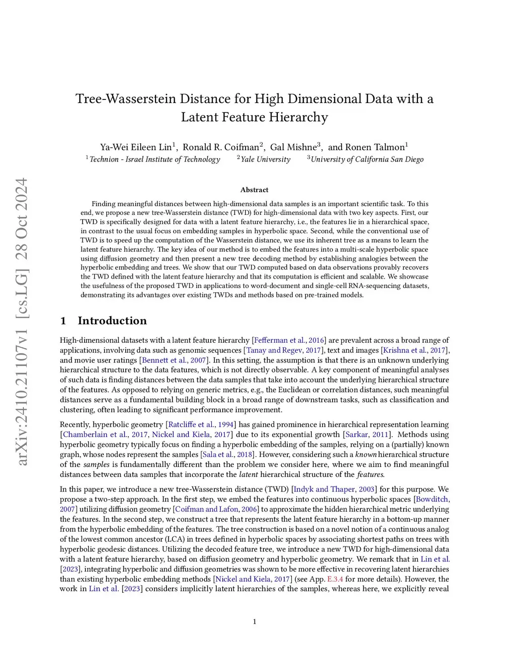 Tree-Wasserstein Distance for High Dimensional Data with a Latent Feature Hierarchy