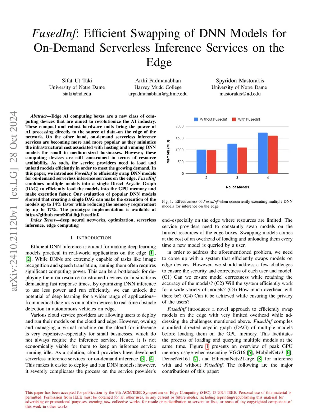 Edge AI computing boxes are a new class of computing devices that are aimed to revolutionize the AI industry. These compact and robust hardware units bring the power of AI processing directly to the source of data--on the edge of the network. On the other hand, on-demand serverless inference services are becoming more and more popular as they minimize the infrastructural cost associated with hosting and running DNN models for small to medium-sized businesses. However, these computing devices are still constrained in terms of resource availability. As such, the service providers need to load and unload models efficiently in order to meet the growing demand. In this paper, we introduce FusedInf to efficiently swap DNN models for on-demand serverless inference services on the edge. FusedInf combines multiple models into a single Direct Acyclic Graph (DAG) to efficiently load the models into the GPU memory and make execution faster. Our evaluation of popular DNN models showed that creating a single DAG can make the execution of the models up to 14\% faster while reducing the memory requirement by up to 17\%. The prototype implementation is available at https://github.com/SifatTaj/FusedInf.