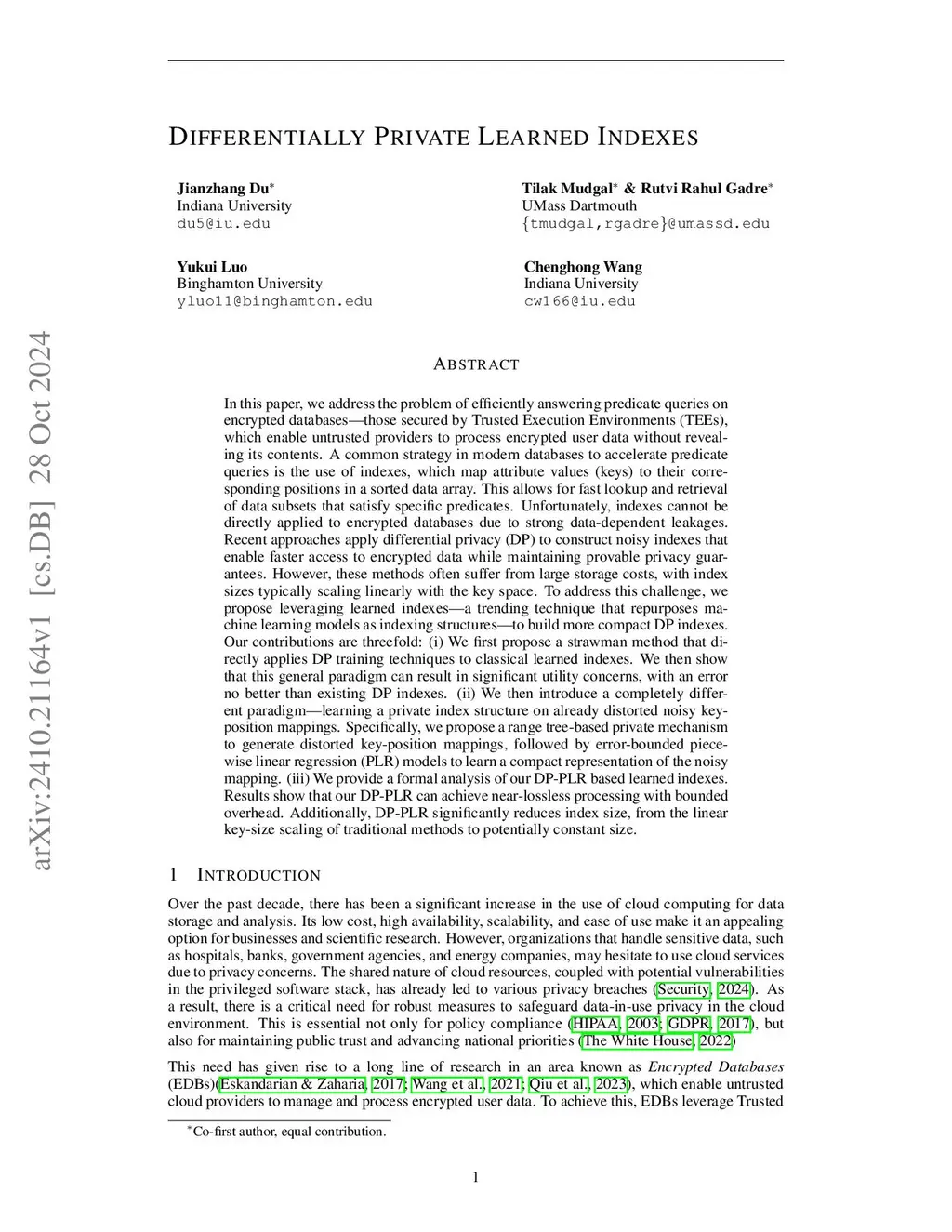 In this paper, we address the problem of efficiently answering predicate queries on encrypted databases, those secured by Trusted Execution Environments (TEEs), which enable untrusted providers to process encrypted user data without revealing its contents. A common strategy in modern databases to accelerate predicate queries is the use of indexes, which map attribute values (keys) to their corresponding positions in a sorted data array. This allows for fast lookup and retrieval of data subsets that satisfy specific predicates. Unfortunately, indexes cannot be directly applied to encrypted databases due to strong data dependent leakages. Recent approaches apply differential privacy (DP) to construct noisy indexes that enable faster access to encrypted data while maintaining provable privacy guarantees. However, these methods often suffer from large storage costs, with index sizes typically scaling linearly with the key space. To address this challenge, we propose leveraging learned indexes, a trending technique that repurposes machine learning models as indexing structures, to build more compact DP indexes.