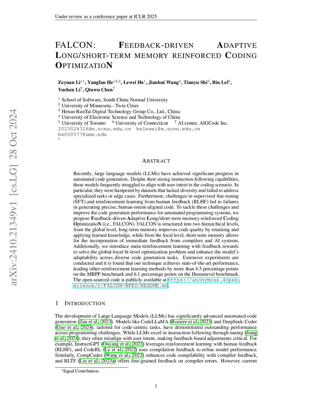 Recently, large language models (LLMs) have achieved significant progress in automated code generation. Despite their strong instruction-following capabilities, these models frequently struggled to align with user intent in coding scenarios. In particular, they were hampered by datasets that lacked diversity and failed to address specialized tasks or edge cases. Furthermore, challenges in supervised fine-tuning (SFT) and reinforcement learning from human feedback (RLHF) led to failures in generating precise, human-intent-aligned code. To tackle these challenges and improve the code generation performance for automated programming systems, we propose Feedback-driven Adaptive Long/short-term memory reinforced Coding Optimization (i.e., FALCON). FALCON is structured into two hierarchical levels. From the global level, long-term memory improves code quality by retaining and applying learned knowledge. At the local level, short-term memory allows for the incorporation of immediate feedback from compilers and AI systems. Additionally, we introduce meta-reinforcement learning with feedback rewards to solve the global-local bi-level optimization problem and enhance the model's adaptability across diverse code generation tasks. Extensive experiments demonstrate that our technique achieves state-of-the-art performance, leading other reinforcement learning methods by more than 4.5 percentage points on the MBPP benchmark and 6.1 percentage points on the Humaneval benchmark. The open-sourced code is publicly available atthis https URL.