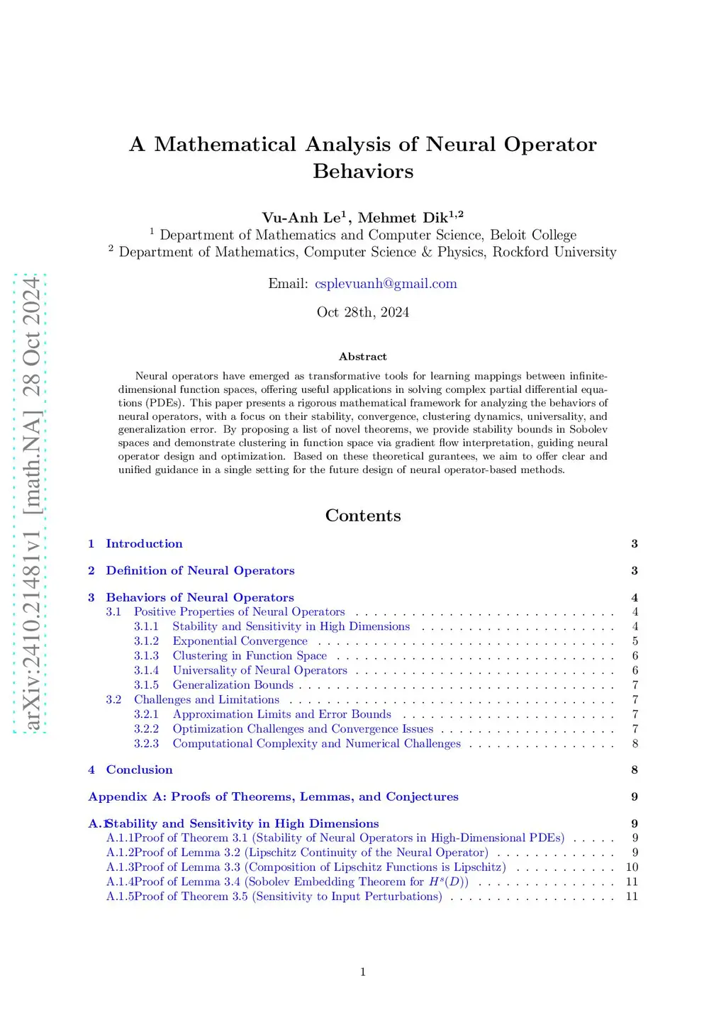 Neural operators have emerged as transformative tools for learning mappings between infinite-dimensional function spaces, offering useful applications in solving complex partial differential equations (PDEs). This paper presents a rigorous mathematical framework for analyzing the behaviors of neural operators, with a focus on their stability, convergence, clustering dynamics, universality, and generalization error. By proposing a list of novel theorems, we provide stability bounds in Sobolev spaces and demonstrate clustering in function space via gradient flow interpretation, guiding neural operator design and optimization. Based on these theoretical gurantees, we aim to offer clear and unified guidance in a single setting for the future design of neural operator-based methods.