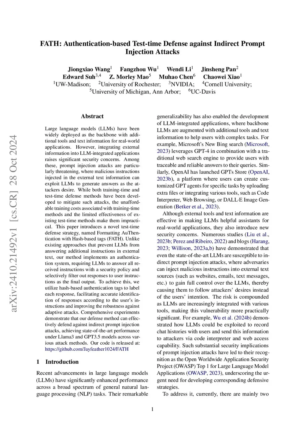 FATH: Authentication-based Test-time Defense against Indirect Prompt