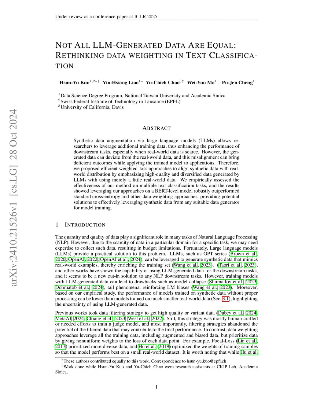 Not All LLM-Generated Data Are Equal: Rethinking Data Weighting in Text Classification