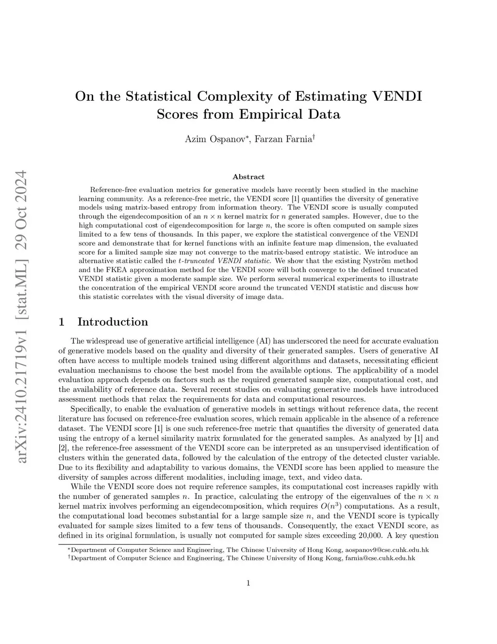 Evaluating the diversity of generative models without reference data poses methodological challenges. The reference-free Vendi and RKE scores address this by quantifying the diversity of generated data using matrix-based entropy measures. Among these two, the Vendi score is typically computed via the eigendecomposition of an kernel matrix constructed from n generated samples. However, the prohibitive computational cost of eigendecomposition for large often limits the number of samples used to fewer than 20,000. In this paper, we investigate the statistical convergence of the Vendi and RKE scores under restricted sample sizes. We numerically demonstrate that, in general, the Vendi score computed with standard sample sizes below 20,000 may not converge to its asymptotic value under infinite sampling. To address this, we introduce the -truncated Vendi score by truncating the eigenspectrum of the kernel matrix, which is provably guaranteed to converge to its population limit with samples. We further show that existing Nyström and FKEA approximation methods converge to the asymptotic limit of the truncated Vendi score. In contrast to the Vendi score, we prove that the RKE score enjoys universal convergence guarantees across all kernel functions. We conduct several numerical experiments to illustrate the concentration of Nyström and FKEA computed Vendi scores around the truncated Vendi score, and we analyze how the truncated Vendi and RKE scores correlate with the diversity of image and text data. The code is available atthis https URL.