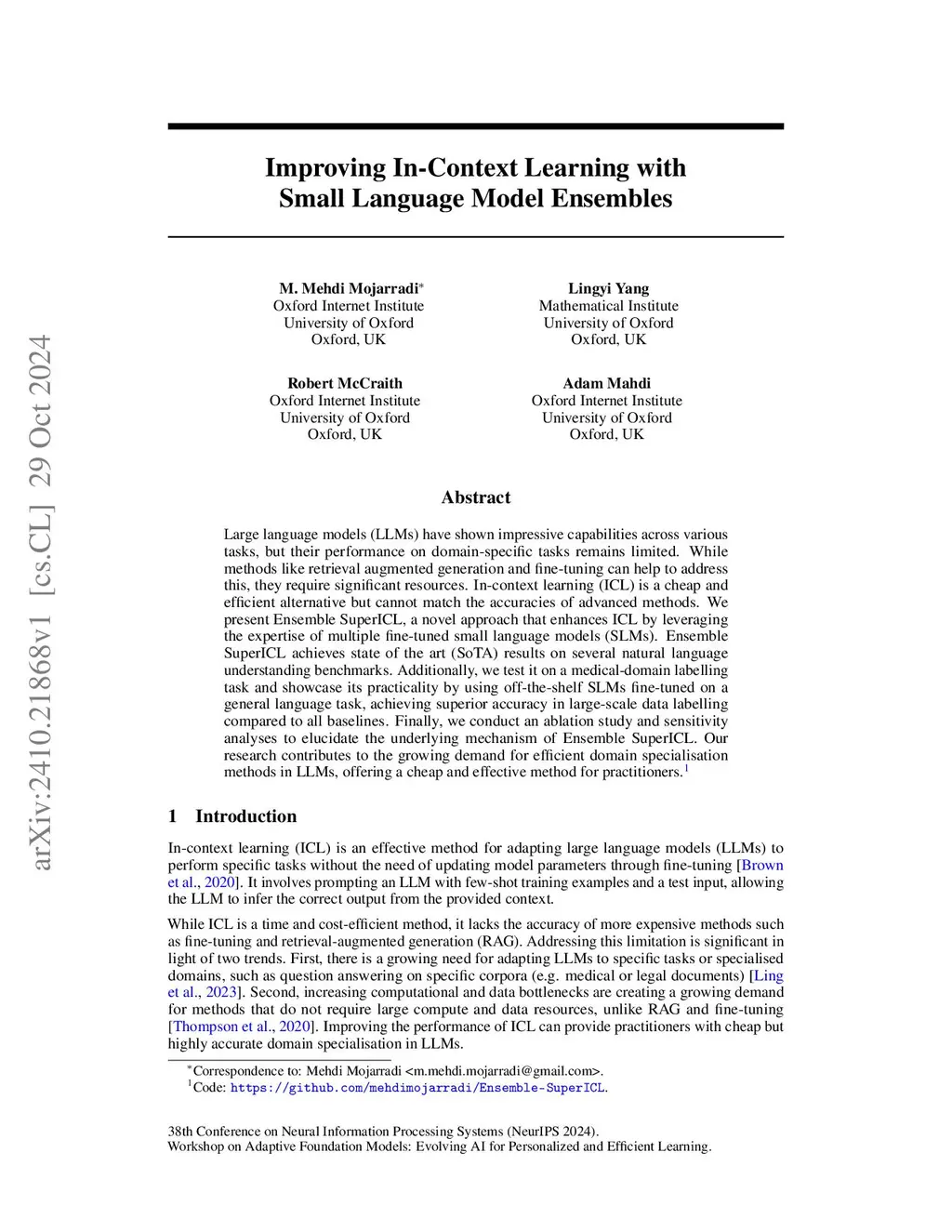 Large language models (LLMs) have shown impressive capabilities across various tasks, but their performance on domain-specific tasks remains limited. While methods like retrieval augmented generation and fine-tuning can help to address this, they require significant resources. In-context learning (ICL) is a cheap and efficient alternative but cannot match the accuracies of advanced methods. We present Ensemble SuperICL, a novel approach that enhances ICL by leveraging the expertise of multiple fine-tuned small language models (SLMs). Ensemble SuperICL achieves state of the art (SoTA) results on several natural language understanding benchmarks. Additionally, we test it on a medical-domain labelling task and showcase its practicality by using off-the-shelf SLMs fine-tuned on a general language task, achieving superior accuracy in large-scale data labelling compared to all baselines. Finally, we conduct an ablation study and sensitivity analyses to elucidate the underlying mechanism of Ensemble SuperICL. Our research contributes to the growing demand for efficient domain specialisation methods in LLMs, offering a cheap and effective method for practitioners.