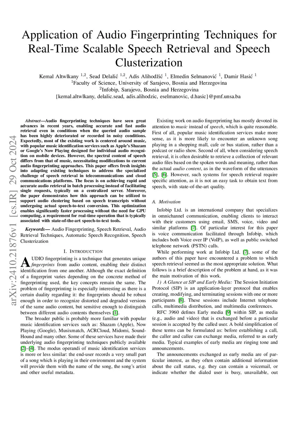 Application of Audio Fingerprinting Techniques for Real-Time Scalable Speech Retrieval and Speech Clusterization